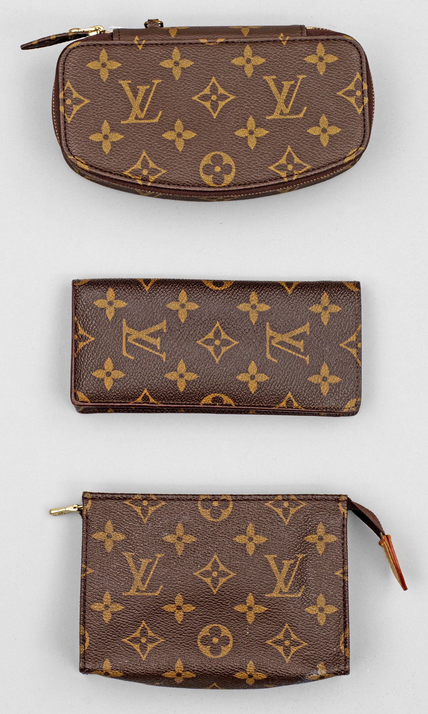 Monogram-Canvas sowie teilw. helles Leder mit gelben Nähten. Brillenetui mit Herstellerzeichen. Date-Code ET1904. L. 16,5 cm; Schmucketui mit Herstellerzeichen. Date-Code MI0935. H. 5 cm. 17 cm x 8,5 cm sowie kleine Kosmetiktasche mit starken Gebrauchsspuren.