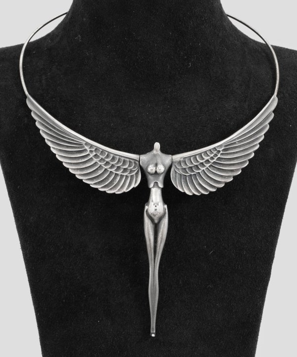 Schmuck-Skulptur in 925er Silber, 1977. Sign., nummeriert 82/10.000 sowie mit Silberstempel. Gießerstempel der Solanor AG, Zürich. Wvz. Spielmann 39. Originaletui. Figur: H. ca. 9 cm, B. ca. 12 cm. Reif: D. ca. 12,5 cm. Gew. ca. 70,5 g.