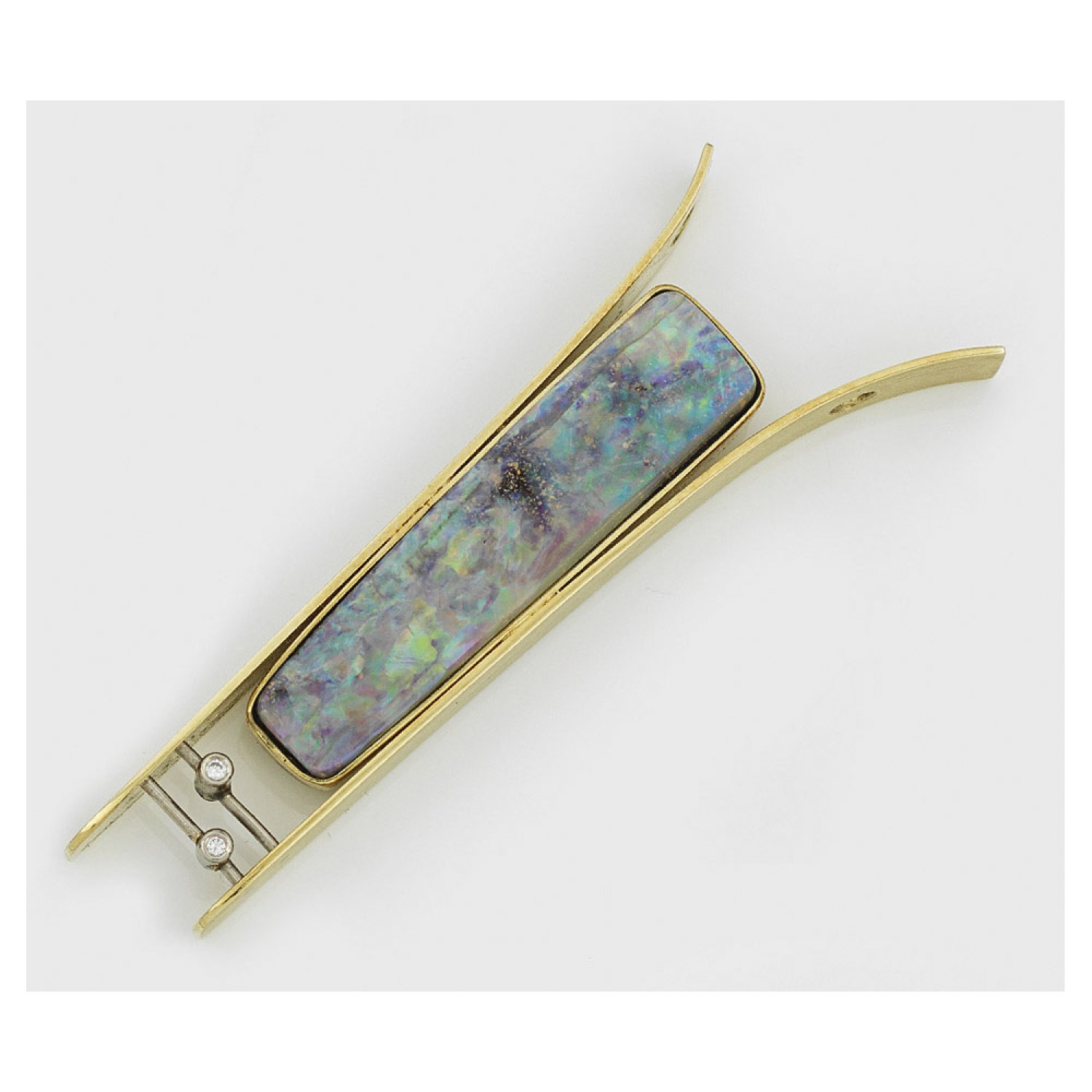 Gelbgold, gest. 750. Zentral besetzt mit einem Opalcabochon, akzentuiert durch 2 kleine Diamanten. Sehr schöne Goldschmiedeausführung. Gew. ca. 22,19 g.