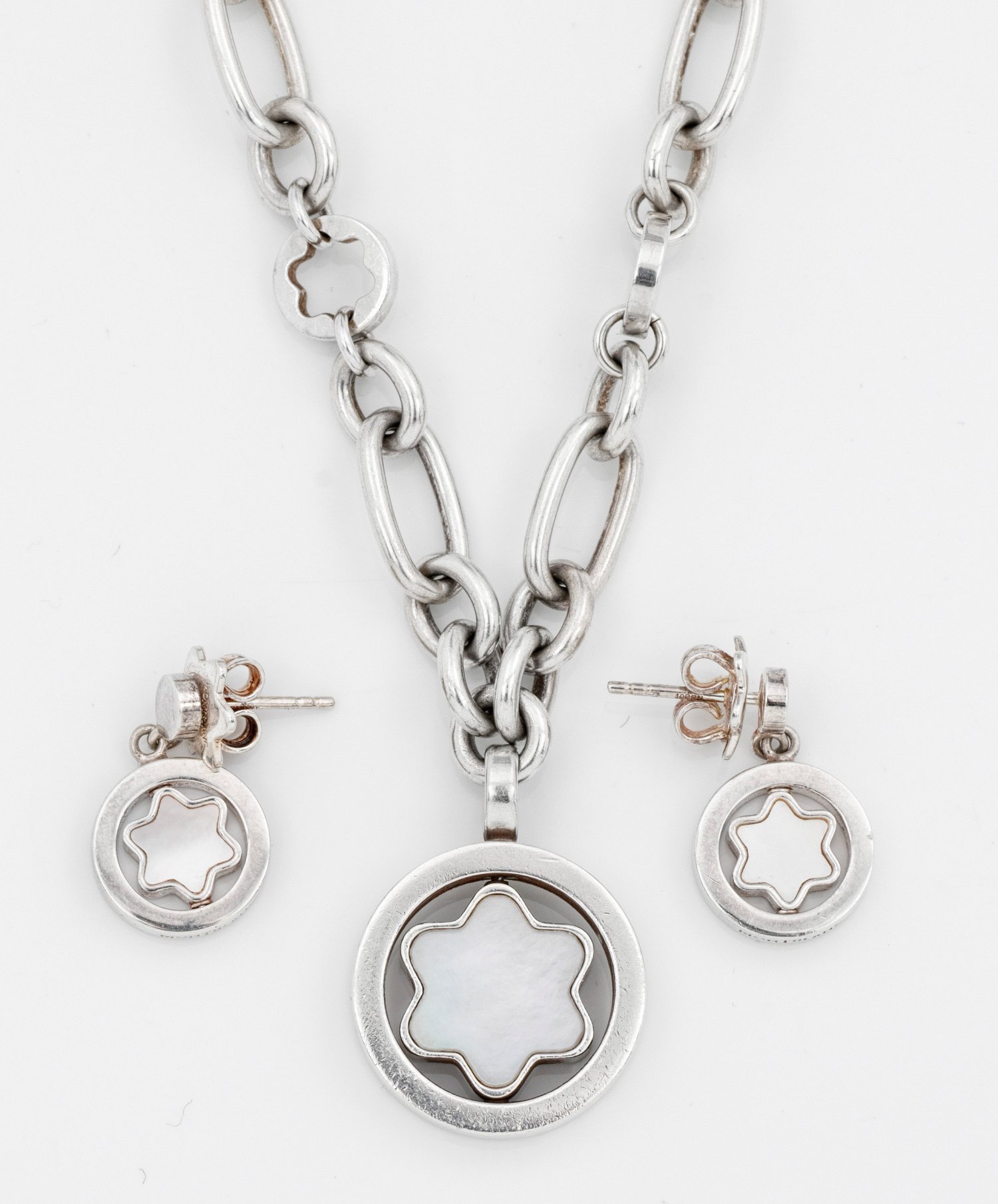 Necklace and pair of earrings by Mont Blanc, in Sterling silver. Manufacturer's mark.