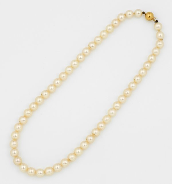 Gelbgold, gest. 585. Einreihige Kette aus weißen Zuchtperlen von ca. 7 mm, in sehr feinem rosé-grün changierendem Lüster.