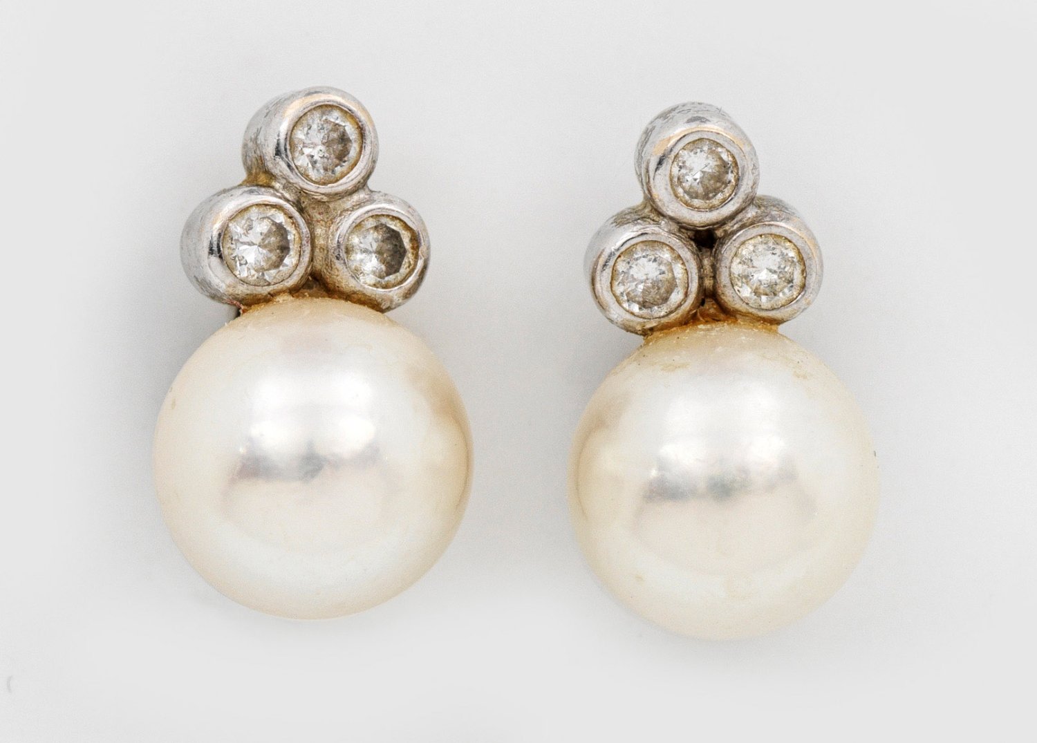 Weißgold, gest. 585. Zentral besetzt mit je einer weißen Zuchtperle von ca. 7 mm in farbintensivem, rosé-grün changierendem Lüster sowie je 3 Diamanten. Ges.-Gew. ca. 2,37 g.