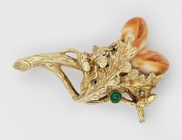 Gelbgold, 14 ct.; Reliefplastisch gefertigtes Eichelblatt, besetzt mit 2 Grandeln und kleinem Smaragdcabochon. Gew. 7,46 g.