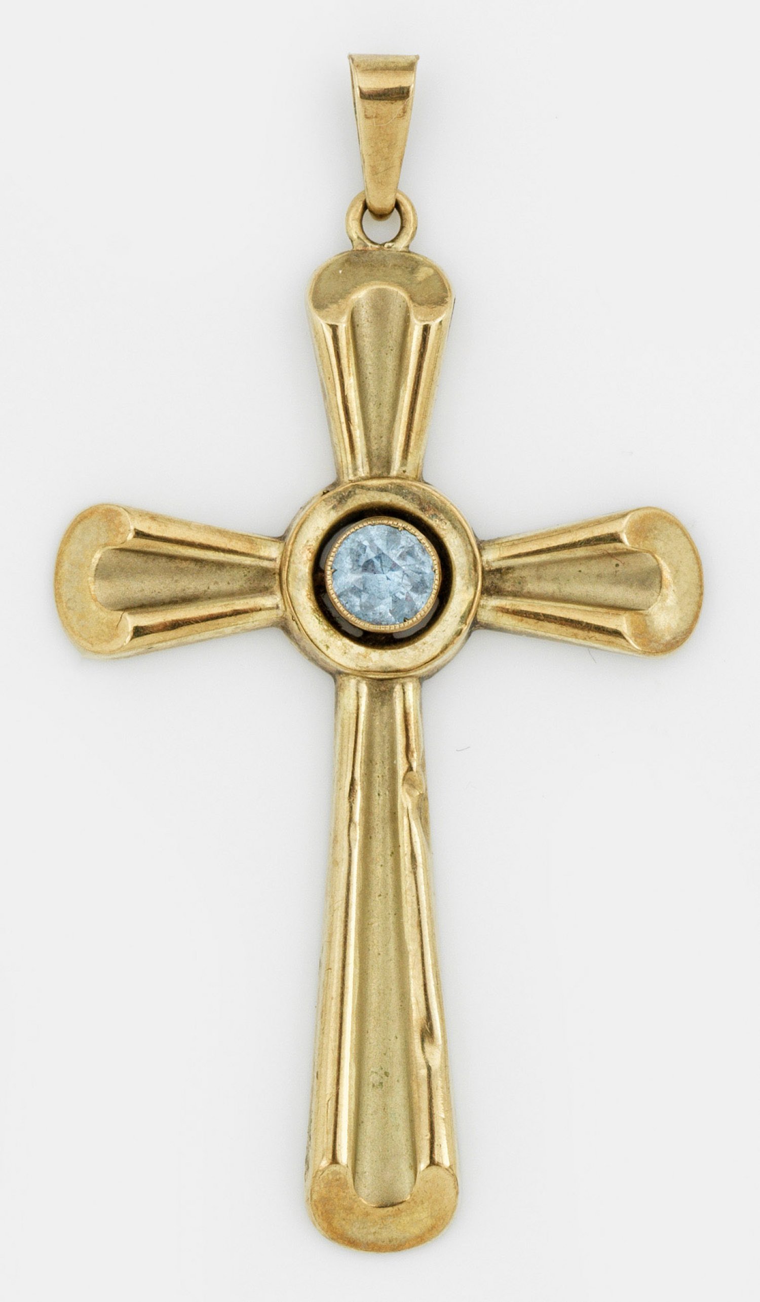 Cross pendant set with an aquamarine approx. 0,25 ct., in 9 k gold.