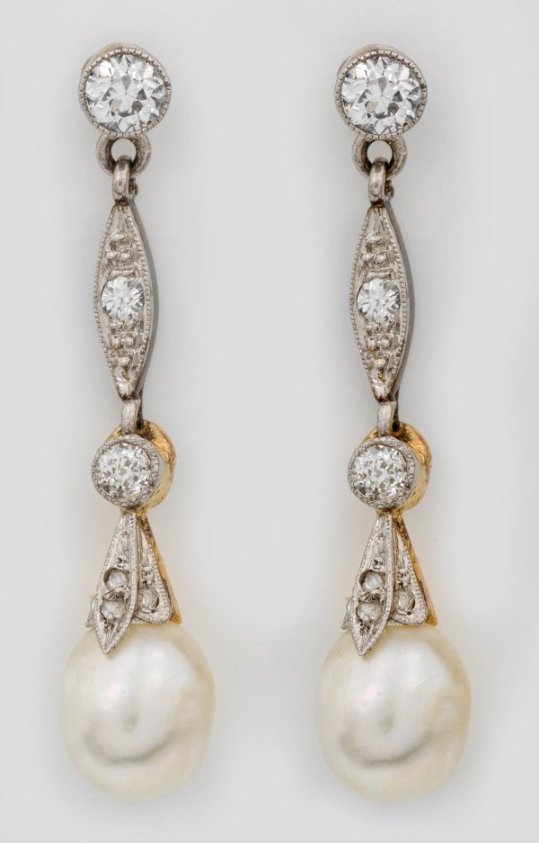 Art nouveau earrings set with diamonds and white culture pearls, mounted in 14 k and 18 k gold.
