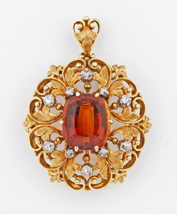 Gelbgold, gest. 750. Vegetabile Brosche in Ajour, zentral besetzt mit einem rot-orangen, facettierten Citrin, akzentuiert durch Diamantrosen. Auch als Anhänger tragbar. Gew. ca. 12,68 g.