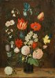 Vor einem dunkel changierendem, braunem Hintergrund steht mittig komponiert auf einer hellbraunen, beidseitig vom Bildrand angeschnittenen Tischplatte, welche den unteren Bildrand in seiner gesamten Breite einnimmt, eine zylindrische Glasvase (ein sog. Blumenglas) mit schräg geripptem, kordelartig reliefiertem Fuß; hierin arrangiert ein Strauß aus detailreich und naturgetreu geschilderten, teilw. farbenprächtigen Frühlings- und Sommerblumen, dessen einzelne Blüten eine beeindruckende Strahlkraft entfalten: eindeutig identifizierbar sind zart rosafarbene Rosen, Maiglöckchen, Schachbrettblume, leuchtend rote, partiell gestromte Tulpen, gelbe Narzissen, Akelei und blaue Iris. Zwischen die, in Farbe und Größe markant hervorgehobenen Blüten hat der Künstler kleinere, weiße, blaue und gelbe Blüten eingebunden, die er zusammen mit Blättern und Stängeln herausragen und überschneiden lässt, um dem Strauß mehr Plastizität und Fülle zu verleihen. Auf der Tischplatte neben der Vase liegen eine weiße Rose, zwei kleine Maiglöckchenblüten und ein Vergissmeinnichtstängel. Trotz der großen Lebendigkeit ausstrahlenden Farbigkeit, ist dieses Stillleben zugleich eine Vanitas-Allegorie - denn auch die hierin dargestellten Blumen werden verwelken. Es zeigt die Kunstfertigkeit des Malers, Blumen aus verschiedenen Monaten und Jahreszeiten in einem Bild zu vereinen, die vergängliche Schönheit der göttlichen Schöpfung wiederzugeben. Entstanden sein dürfte das vorliegende Gemälde von Jan Brueghel d. J. in der Zeit nach seiner Italien-Reise und nach der Übernahme der väterlichen Werkstatt 1625 bis Mitte der 1630er Jahre, als er den unverwechselbaren Stil des Vaters weiterführte. Dieses Blumenbild zeigt, dass es ihm wie kaum einem anderen Maler seiner Zeit gelang, an das väterliche Qualitätsniveau heranzukommen. Als Vorbilder könnten in Motiv, Komposition und Stil mehrere Blumenstillleben des Vaters gedient haben, die er ab circa 1602/1608 und in den Jahren danach schuf (Vgl. Klaus Ertz: "Jan Brueghel der Ältere. Die Gemälde mit kritischem Werkkatalog", Köln 1979, Nr. 178, 180-82). In einer Reihe von Werken griff Jan Brueghel d. J. seit circa 1620 hierauf zurück. Die in Komposition und Stil vergleichbaren Gemälde sind insbesondere das "Blumenglas mit Frosch" (im Prado, Madrid; um 1620); "Blumen in Glasvase" (Ashmolean Museum, Oxford; um 1620) und "Blumen in Glasvase" (Rijksmuseum, Amsterdam, Ende 1620er Jahre). Öl/Eichenholztafel. Verso altes Etikett mit Nr. u. Bez. "3702 Mme. Rousset". 46,6 cm x 33,1 cm. Rahmen.