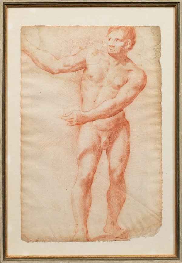 Ein Hauptsujet des zeichnerischen Oeuvres von Dubourg waren mit Vorliebe in Röteltechnik ausgeführte, männliche Akte. Vergleichbare Zeichnungen befinden sich u. a. im Rijksmuseum in Amsterdam. Rötel/Bütten. 42,5 cm x 28 cm. Rahmen.