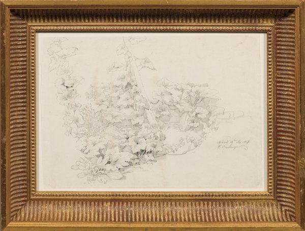 Bamberger unternahm 1840 und 1847 - 1868 mehrere Reisen nach Spanien, darunter nach Madrid, wo er 1857 diese Pflanzenstudie zeichnete. Bleistift/Papier. R. u. sign. sowie mit Ortsangabe Madrid und dat. 29ten Sep. 1857. Verso Sammlungsstempel in Blau: Georg Hamminger (Lugt 1159). Blatt 23,5 cm x 34,5 cm. Rahmen.