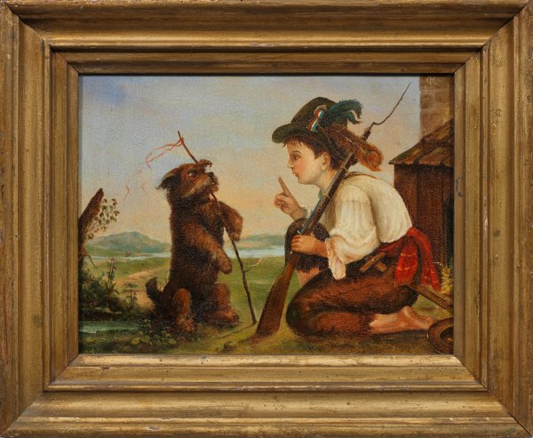 Nach dem humoristisch-politischen, 1848 von Friedrich Dürck (1809 Leipzig - 1884 München) gemalten Genrebild, das sich bis 1857 in der Kollektion des berühmten Kunstsammlers Maximilian Speck von Sternburg (1776 Gröba - 1856 Leipzig) befand. Öl/Eichenplatte. R. o. ligiert monogr. u. dat. 1864. 23,3 cm x 30 cm. Rahmen.