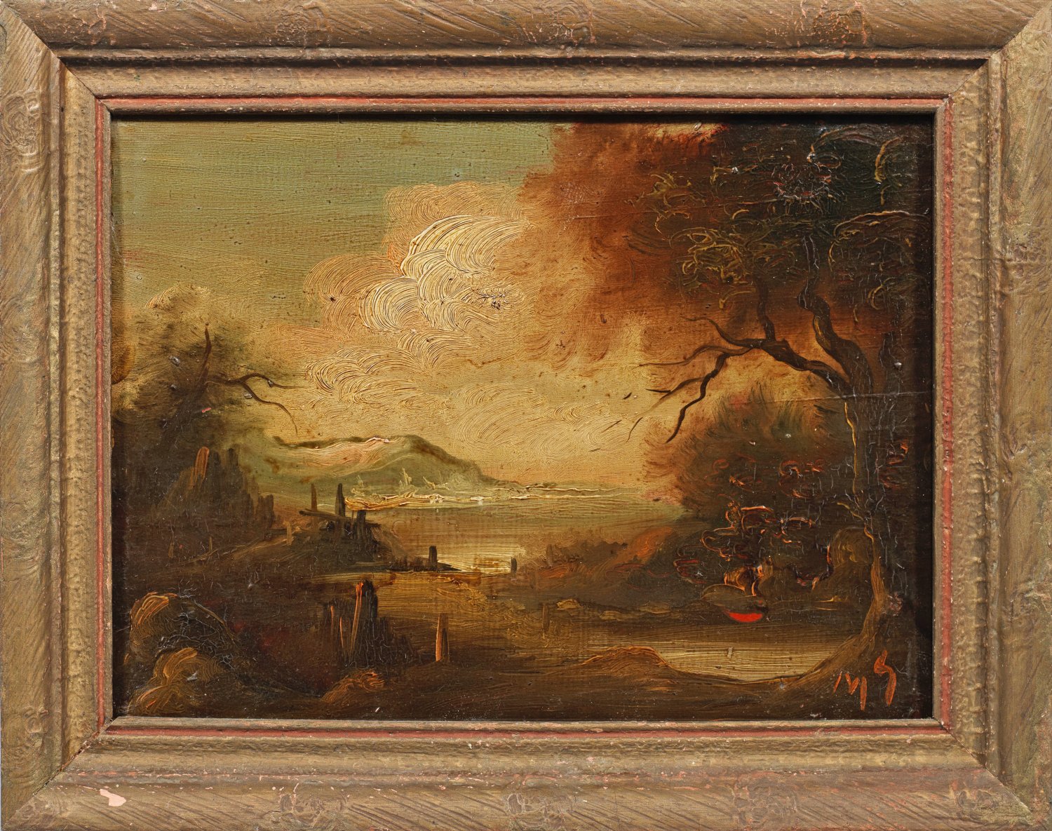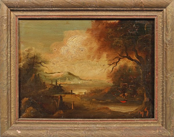 Stimmungsvolle, bergige Landschaft mit der Ansicht eines Seeufers. Öl/Holzplatte. R. u. monogr.; 18 cm x 24 cm. Rahmen.