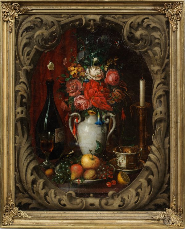 Stillleben mit Blumen, Früchten, Wein und Andenkentasse