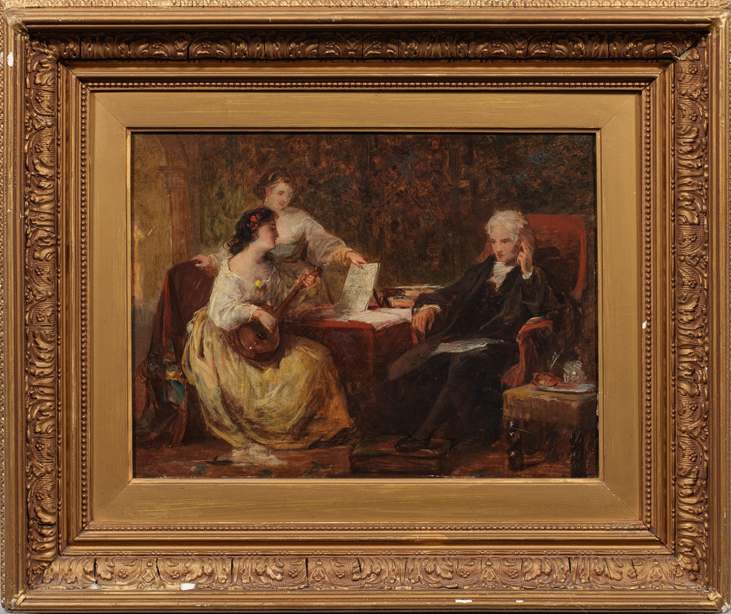 In flüchtigem Duktus angelegte, um 1850 entstandene Genreszene, die in Stil und Motivik Assoziationen zu Werken von Frederick Daniel Hardy (1826 - 1911) weckt. Öl/Lwd.; Rückseitiger Malwarenstempel "Rowney Dillon Rowney" (act. 1844 - 1848). 30,5 cm x 40,5 cm. Rahmen.