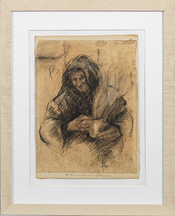 Subtil beobachtetes Bildnis eines in eine Decke eingehüllten Mannes mit dampfendem Getränk in den Händen. Kohle und Kreide/Papier, kaschiert a. Papier. L. o. monogr. sowie auf dem Karton unterhalb mittig betitelt und sign.; Blatt 33,5 cm x 25,8 cm. Karton 36,1 cm x 26,2 cm. Rahmen.