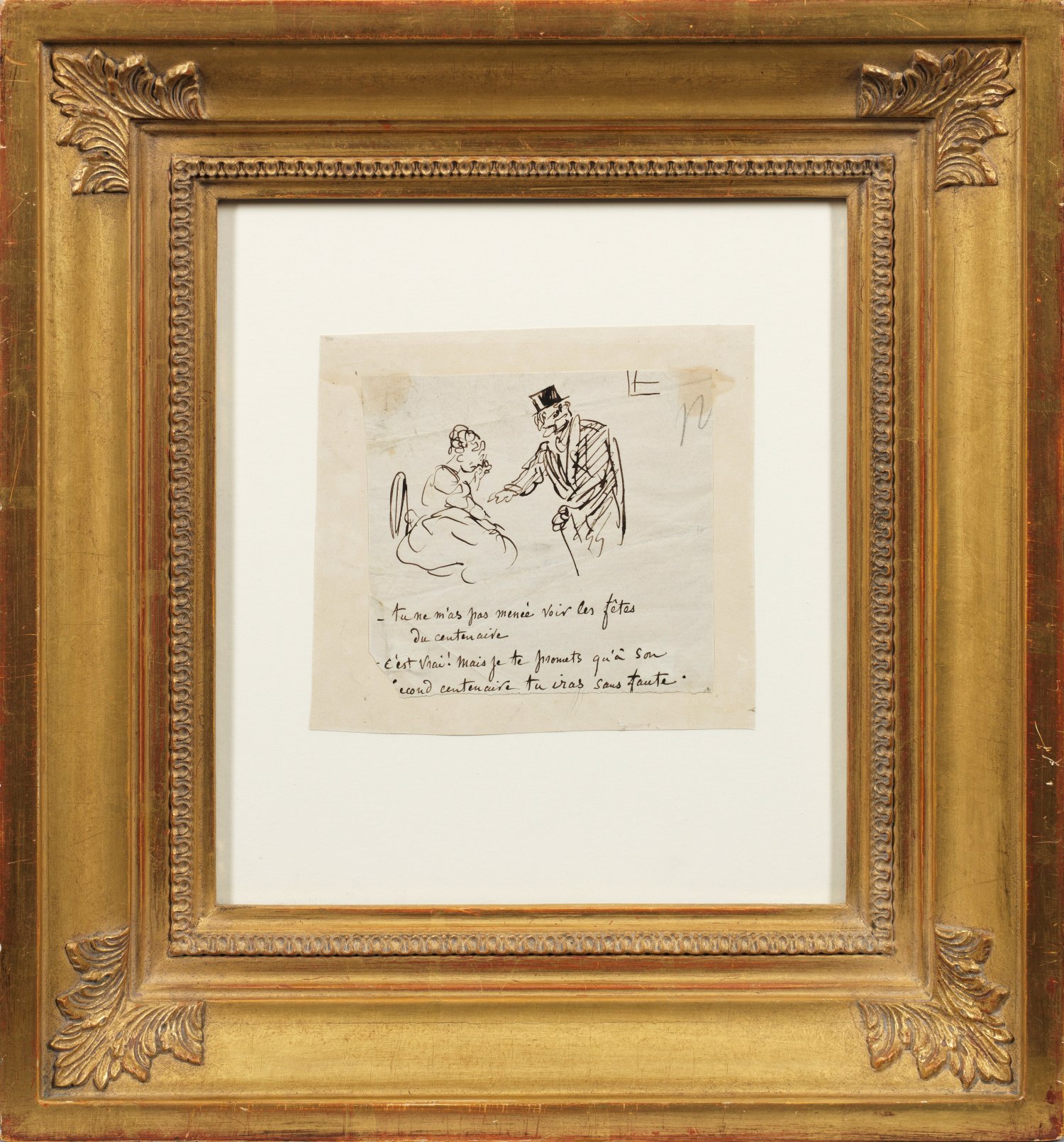 Szenische Darstellung eines stehendenen, älteren Mannes mit Zylinder, der wortreich eine niedergeschlagen sitzende junge Frau belehrt. Feder/Papier. Ca. 10,5 cm x 11 cm. Rahmen.