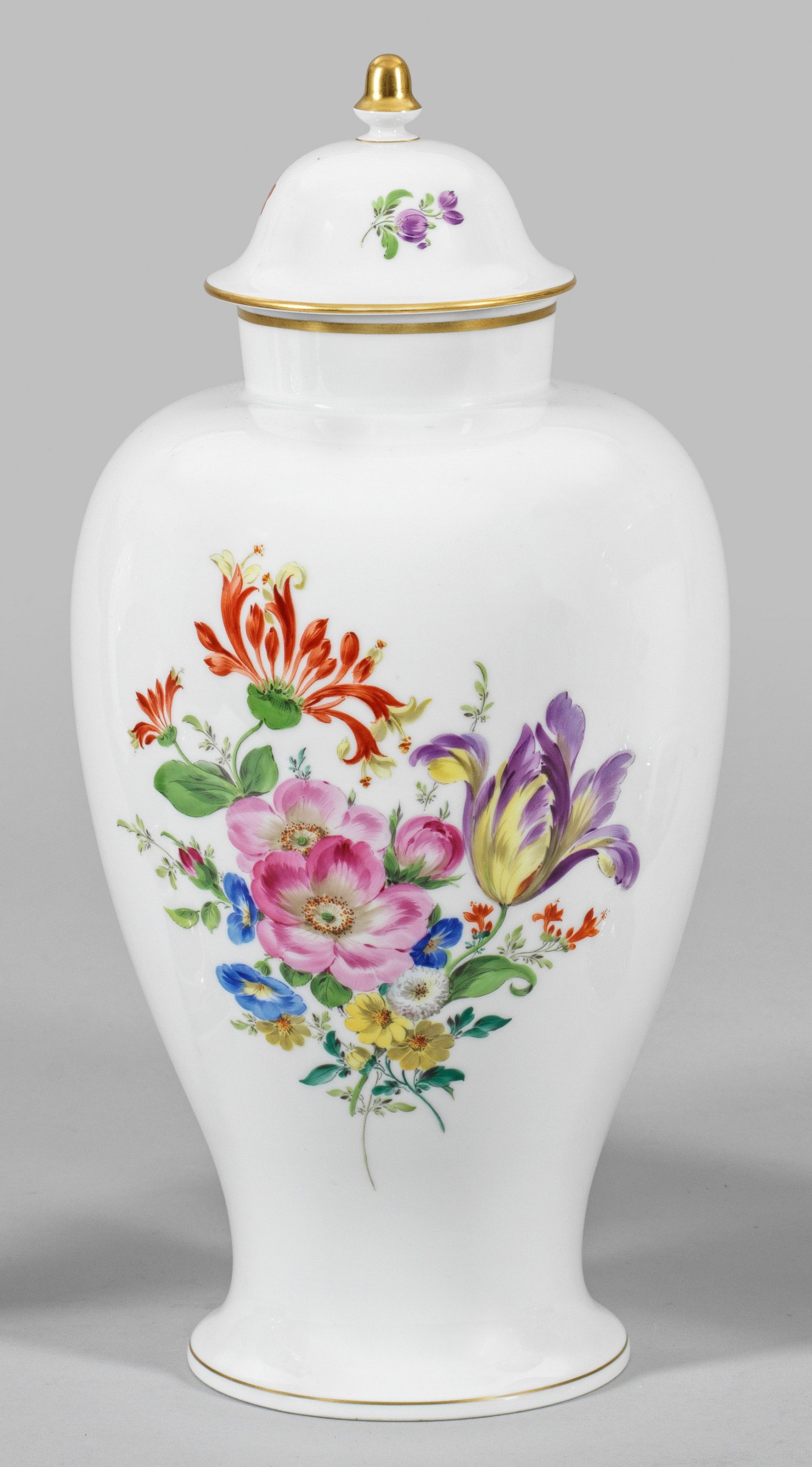 Balusterförmiger Korpus auf ausgestelltem Stand. Aufgewölbter Deckel mit stilisiertem, goldstaffiertem Zapfenknauf. Beidseitig der Wandung großflächiges, farbenprächtiges Blumenarrangement bzw. kleines Blumengebinde, auf dem Deckel gestreute Blütenzweige. Polychrome Malerei. Goldrand. Schwertermarke. H. 37 cm.
