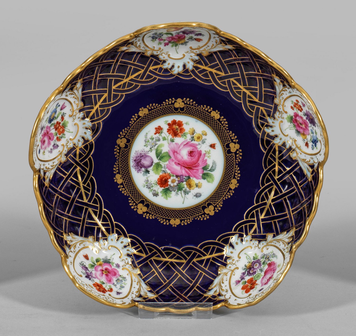 Runde, gemuldete Form. Kobaltblauer Fond. Im Spiegel Goldmedaillon mit farbenprächtigem Blumengebinde. Auf der Innenwandung, zwischen Korbgeflechtrelief, hochgezogene Rocaillekartuschen mit korrespondierendem Blumendekor auf weißem Grund. Polychrome Malerei mit reicher Goldstaffage. Minim. rest.; Schwertermarke. D. 22 cm.