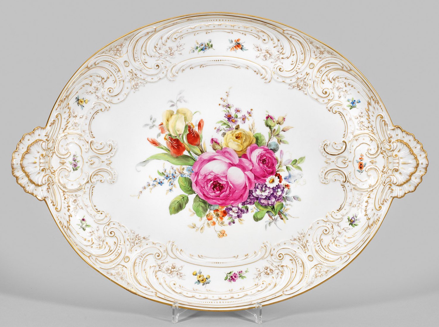 Ovale Form, seitliche Handhaben. Reicher, stark reliefplastischer und goldstaffierter Dekor aus Muschel- und Blattrocaillen sowie Blütenzweigen. Im leicht vertieften Spiegel großes, farbenprächtiges Blumenarrangement mit vereinzelten Streublüten in feiner polychromer Malerei. Am Rand minim. rest.; Zeptermarke. 61 cm x 44 cm.