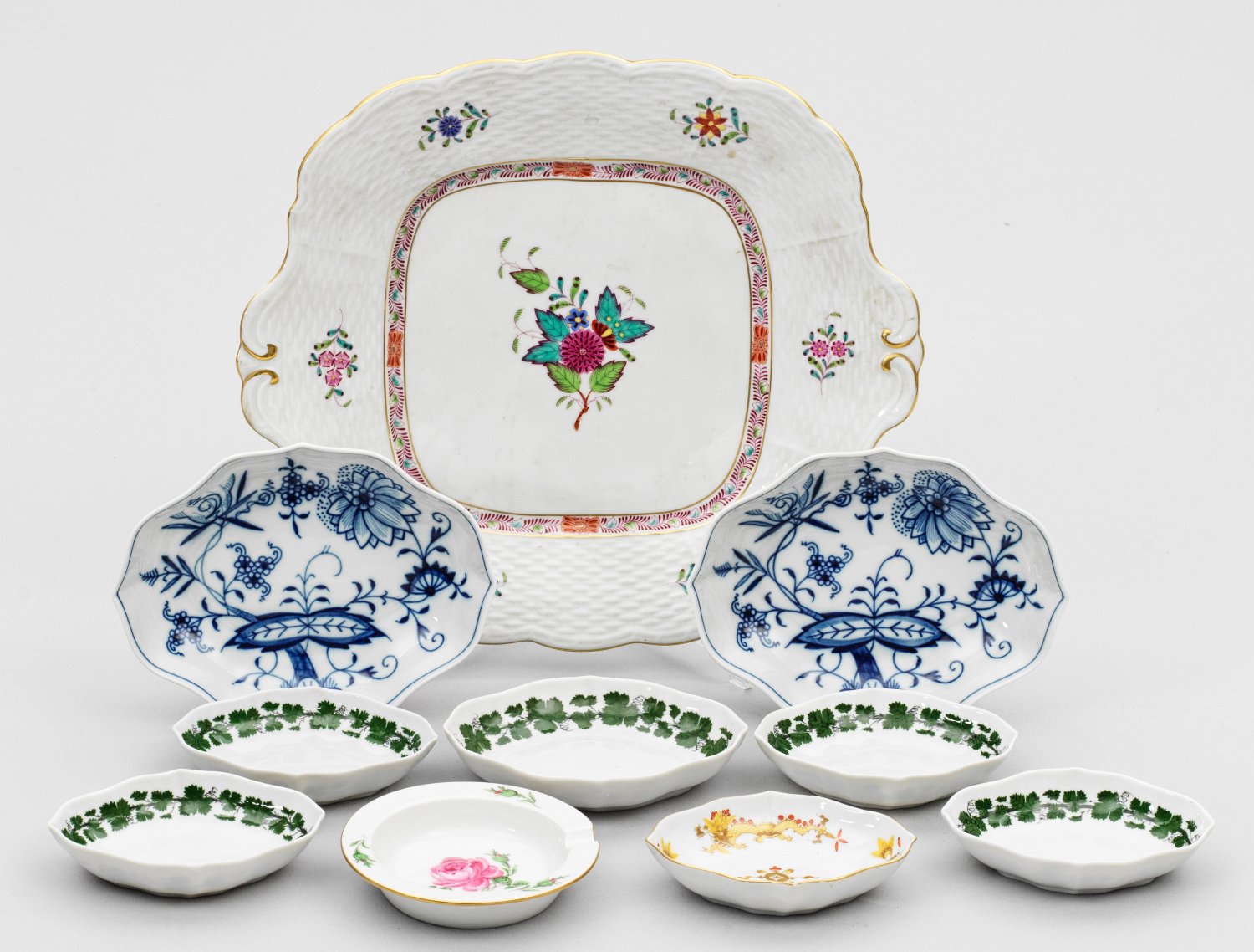 9-tlg.; 8 passige Schälchen und Aschenbecher. Zwiebelmuster-, Weinlaub-, "Rote Rose"-, "Reicher gelber Drache"-Dekor. Polychrome und Unterglasurmalerei, teilw. mit Gold. Schwertermarke. Beigabe: Herend-Anbietteller mit Indianischem Dekor, best.; 20. Jh. Schälchen-L. 10 cm - 15 cm. D. 9,5 cm. 24,5 cm x 27,5 cm.