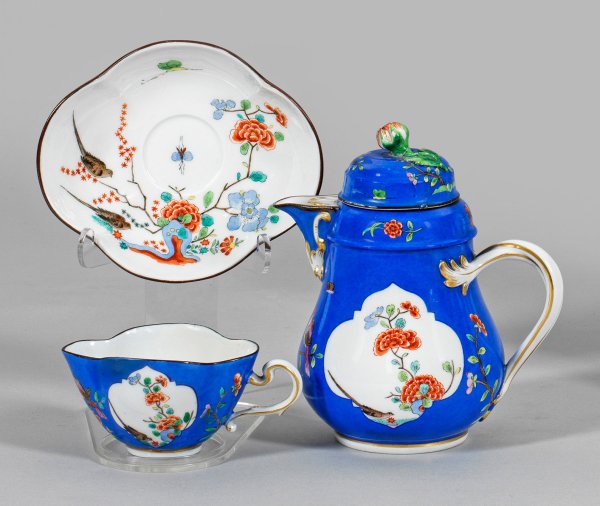 auf Untertasse. Königsblauer Fond. Auf der Wandung und im Spiegel, teilw. in vierpassig ausgesparten Reserven gerahmter Dekor aus stilisierter Felslandschaft mit indianischen Blumen, Vögeln und Insekten in polychromer Malerei. Teilw. Goldstaffage. Rest.; Schwertermarke. H. 4,5 cm - 15 cm.
