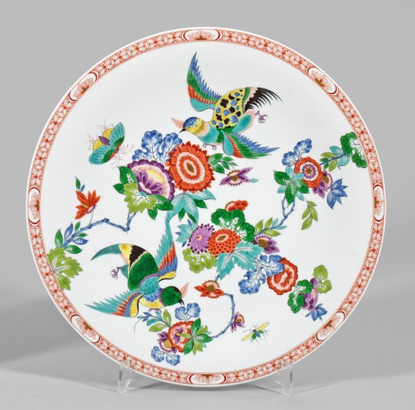 Runde, leicht vertiefte Form. Farbenprächtiger Indianischer Blumendekor aus Chrysanthemen- und Päonienzweigen sowie fliegendem Vogel im Kakiemonstil. Polychrome, goldgehöhte Malerei. Umlaufende Ornamentbordüre. Schwertermarke. D. 31 cm.