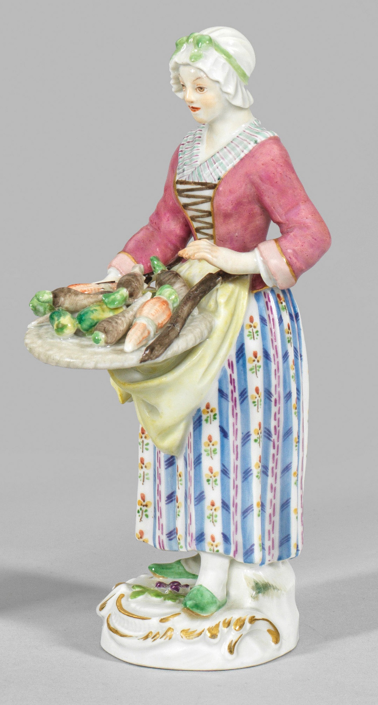 Auf einem Rocaillesockel stehende junge Frau mit zum Kauf anbietenden Gemüsesorten auf einem Weidentablett. Polychrome Malerei mit Goldstaffage. Entw. J. J. Kaendler und P. Reinicke. Minim. best.; Schwertermarke. H. 14 cm.