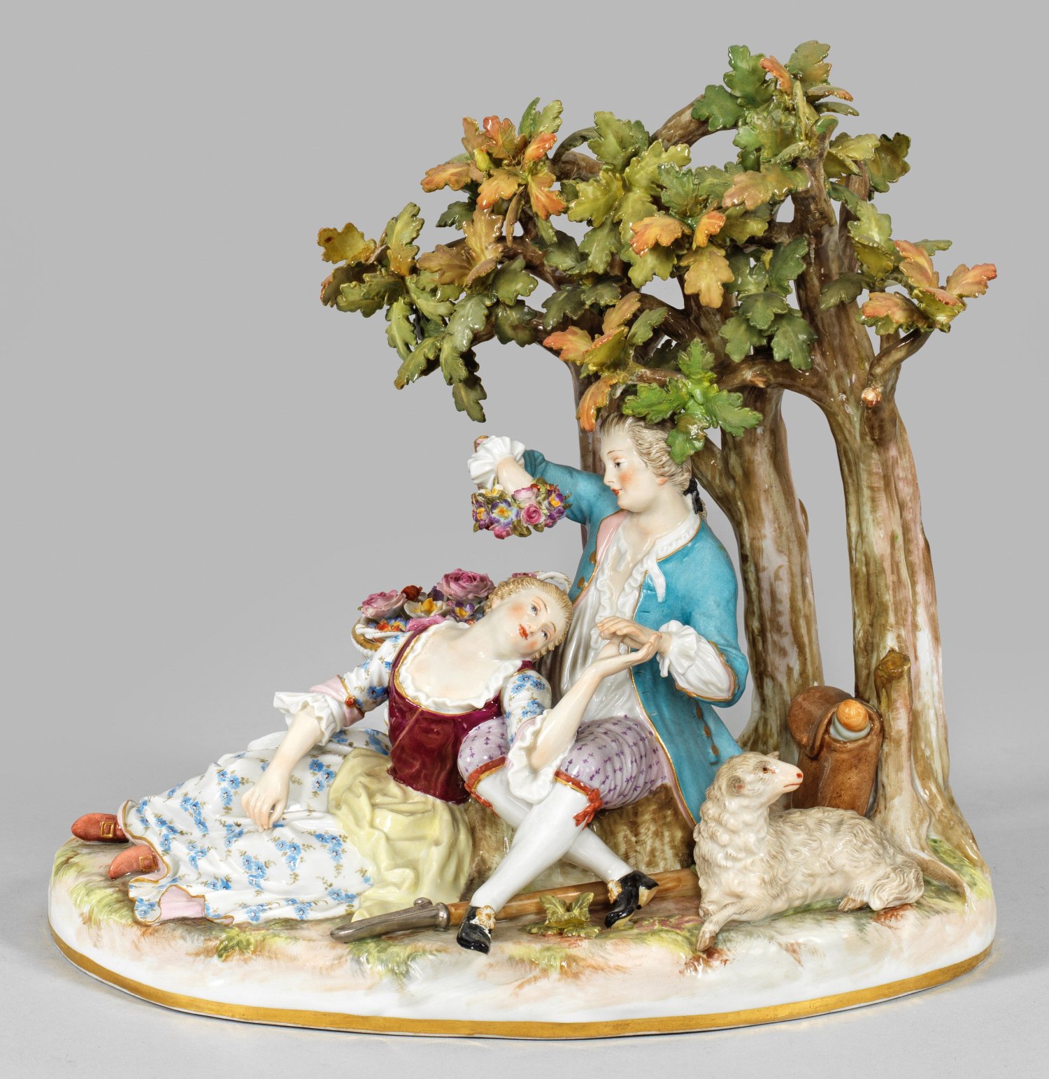 Naturalistisch gestalteter Ovalsockel. Unter belaubten Eichenbäumen innig beieinander sitzendes Schäferpaar. Umliegend ein mit plastischen Blüten gefüllter Weidenkorb und Schäferstab. Zu ihren Füßen ruhendes Schaf. Polychrome Malerei mit dezenter Goldstaffage. Entw. Johann Joachim Kaendler. Modell-Nr. 485. Minim. best./rep.; Unw. rest.; Schwertermarke. H. 24 cm. B. 25 cm.