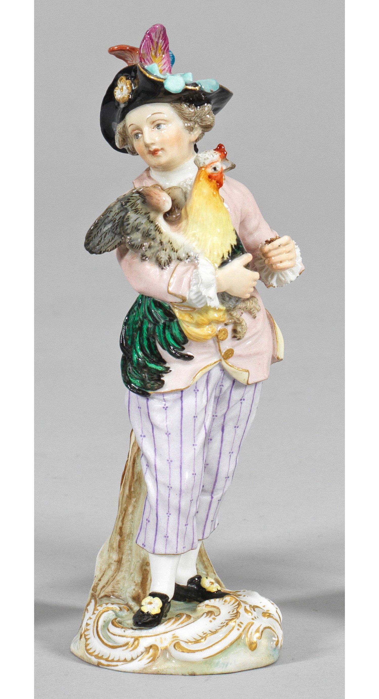 Auf einem Rocaillesockel stehender Knabe, in der rechten Hand einen prachtvollen Hahn festhaltend. Polychrome Malerei mit Goldstaffage. Entw. J. J. Kaendler. Modell-Nr. 21. Rest.; Schwertermarke. H. 15,5 cm.