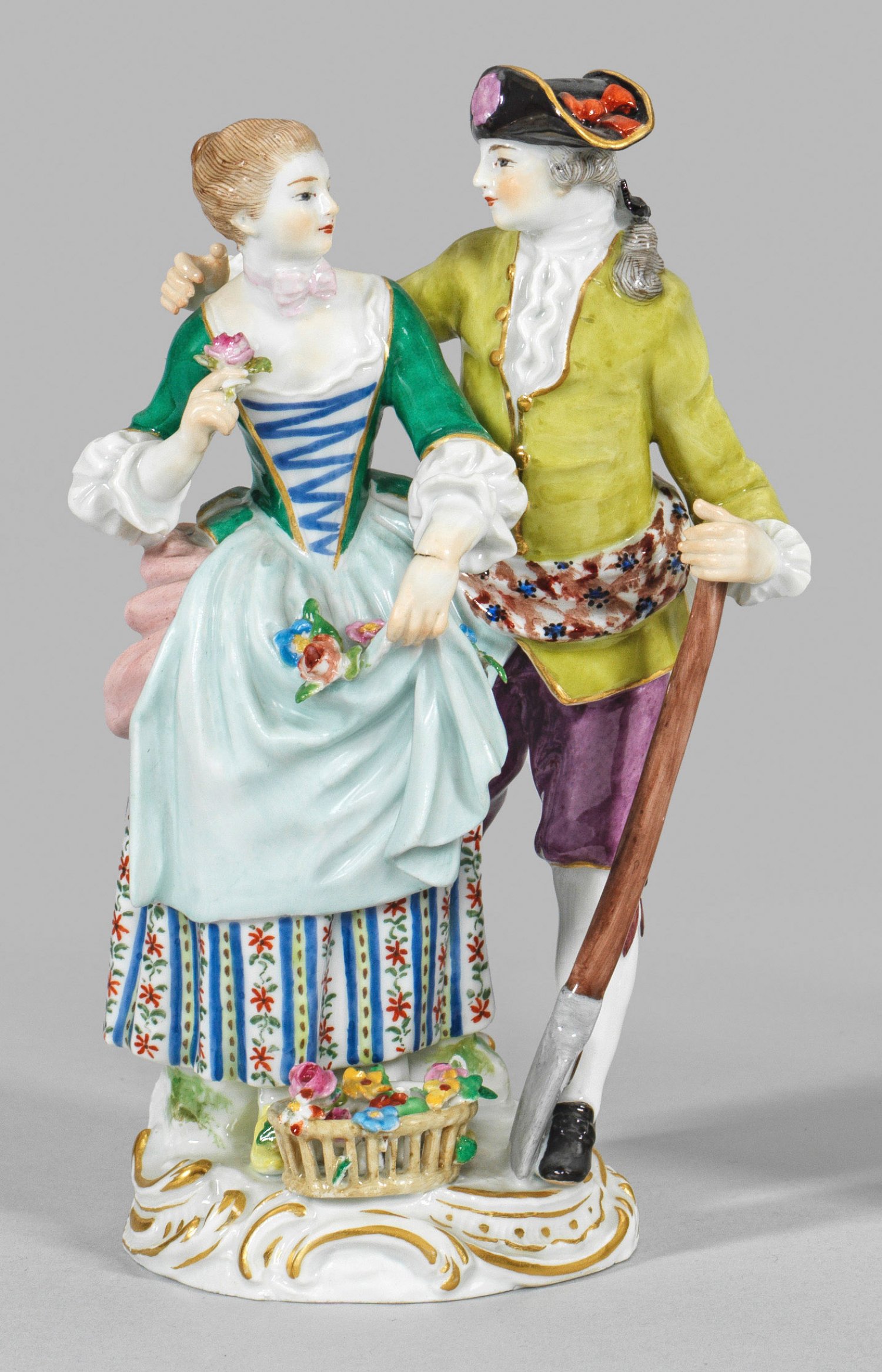 Sich umarmendes Paar mit Blumenkorb und Schaufel auf Rocaillesockel. Polychrome Malerei mit Goldstaffage. Entw. J. J. Kaendler. Modell-Nr. 37. Minim. best./besch.; Schwertermarke. H. 15,5 cm.