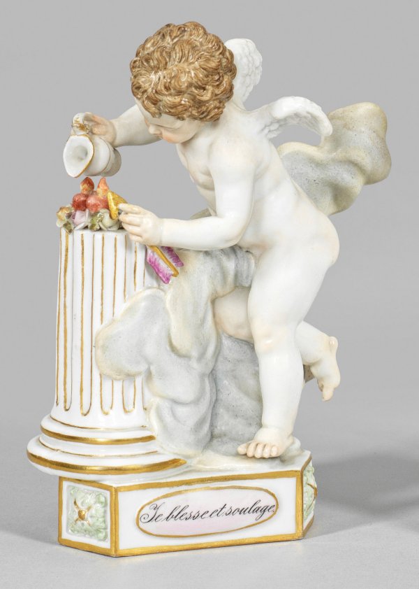 Dreiseitiger Sockel mit Rosetten, bez. "Je blesse et soulage". Vor einer Säule auf einer Wolke stehende Amorette, brennende Herzen gießend. Polychrome Malerei mit Goldkonturierung. Entw. Michel Victor Acier. Modell-Nr. F 14. Minim. rest.; Schwertermarke. H. 13,5 cm.