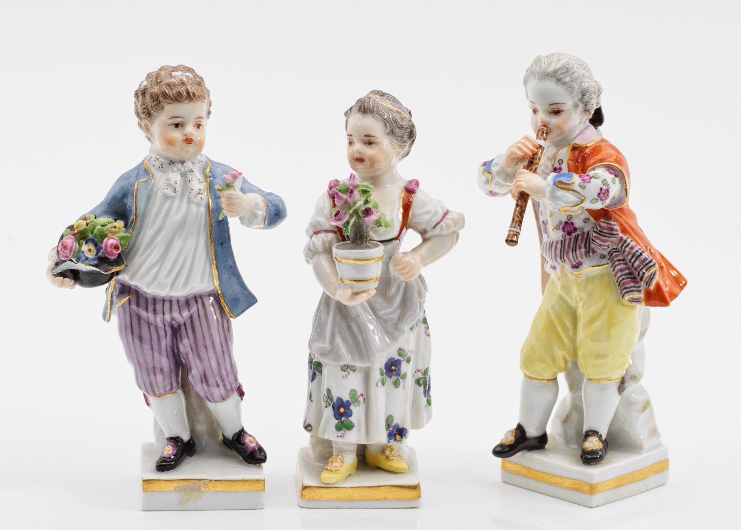 mit Blumentopf, blütengefülltem Hut bzw. Flöte. Polychrome Malerei. Goldstaffage. Entw. M. V. Acier. Best./besch.; Schwertermarke. H. 9,5 cm - 10,5 cm.