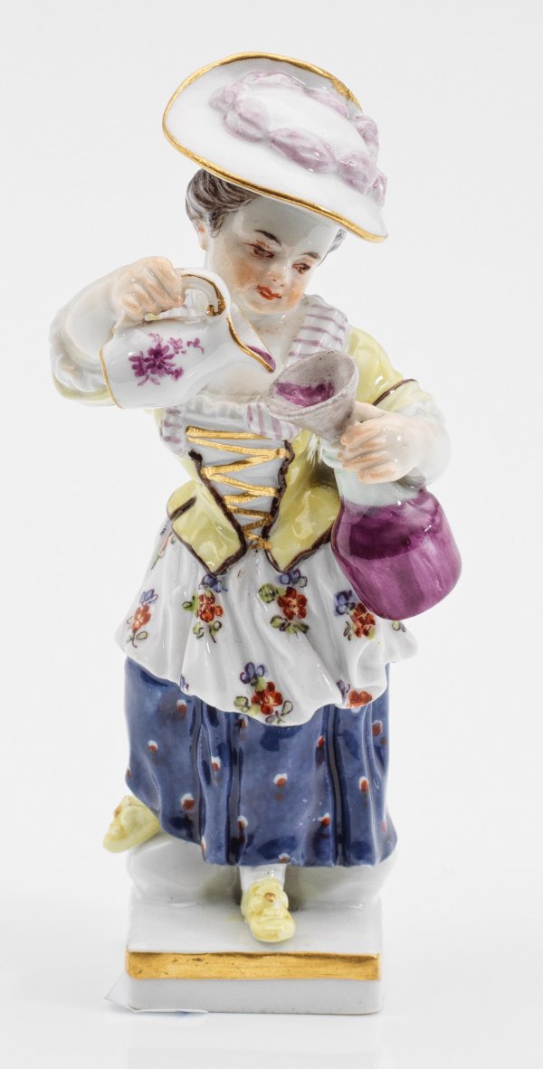 Auf quadratischem Sockel stehende Winzerin, Wein aus einem Kurg in eine Flasche füllend. Polychrome Malerei mit Gold. Modell-Nr. G 6. Schwertermarke. H. 10,5 cm.