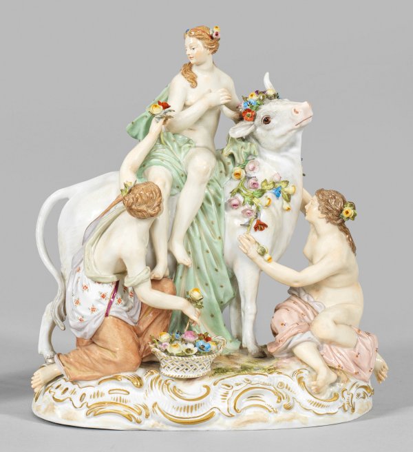 Über rocaillereliefiertem Sockel, Europa auf einem blumengeschmückten Stier sitzend. Begleitend zwei kniende Nymphen mit Blumenkorb. Polychrome Malerei mit Goldstaffage. Entw. Johann Joachim Kaendler. Modell-Nr. 2697. Minim. best.; Schwertermarke. H. 22 cm. B. 20 cm.