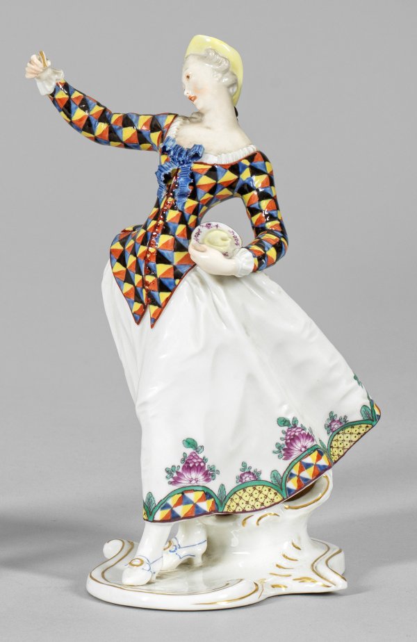 Auf geschweiftem Rocaillesockel mit aufsteigender Stützvolute stehende Lalage in bunt kariertem Mieder und weißem, bortiertem Rock. In der rechten Hand einen Löffel, in der Linken ein Breischale haltend. Polychrome Malerei mit Goldstaffage. Entw. Franz Anton Bustelli. Minim. best.; Manufakturmarke. H. 19,5 cm.