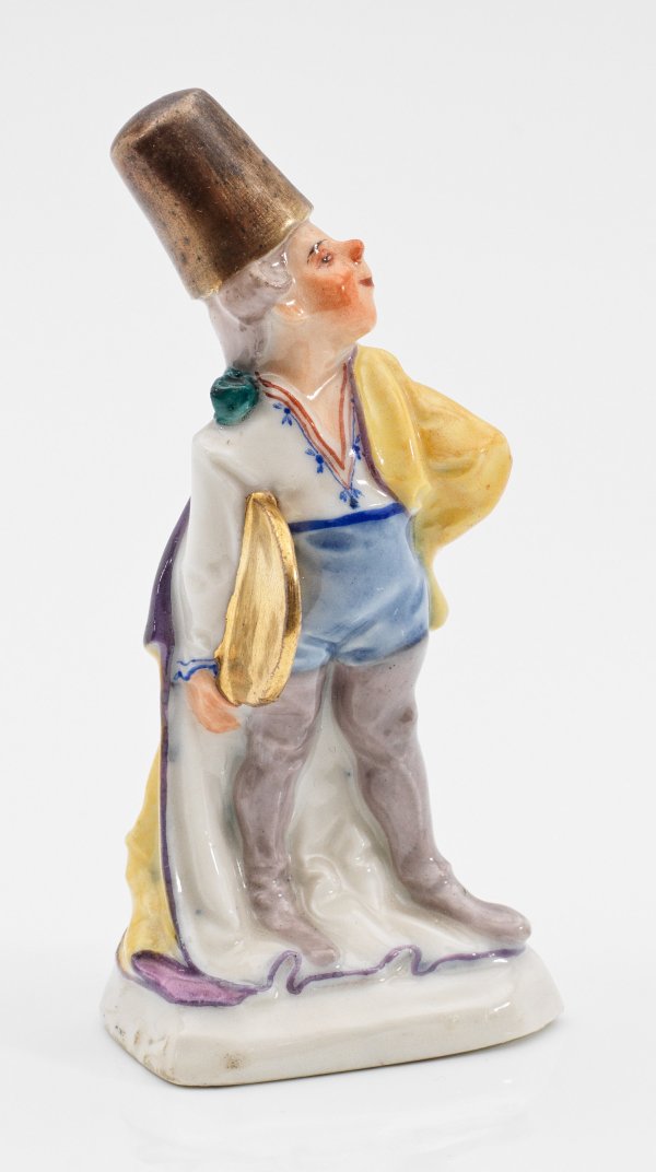 Auf eckigem Sockel stehender, kostümierter Knabe mit Tarbusch und Scheibe. Polychrome Malerei mit Gold. Entw. Martin Wiegand. Eingepresste Künstlerstempel sowie Werkstattmarke "Meissen München". H. 11,5 cm.