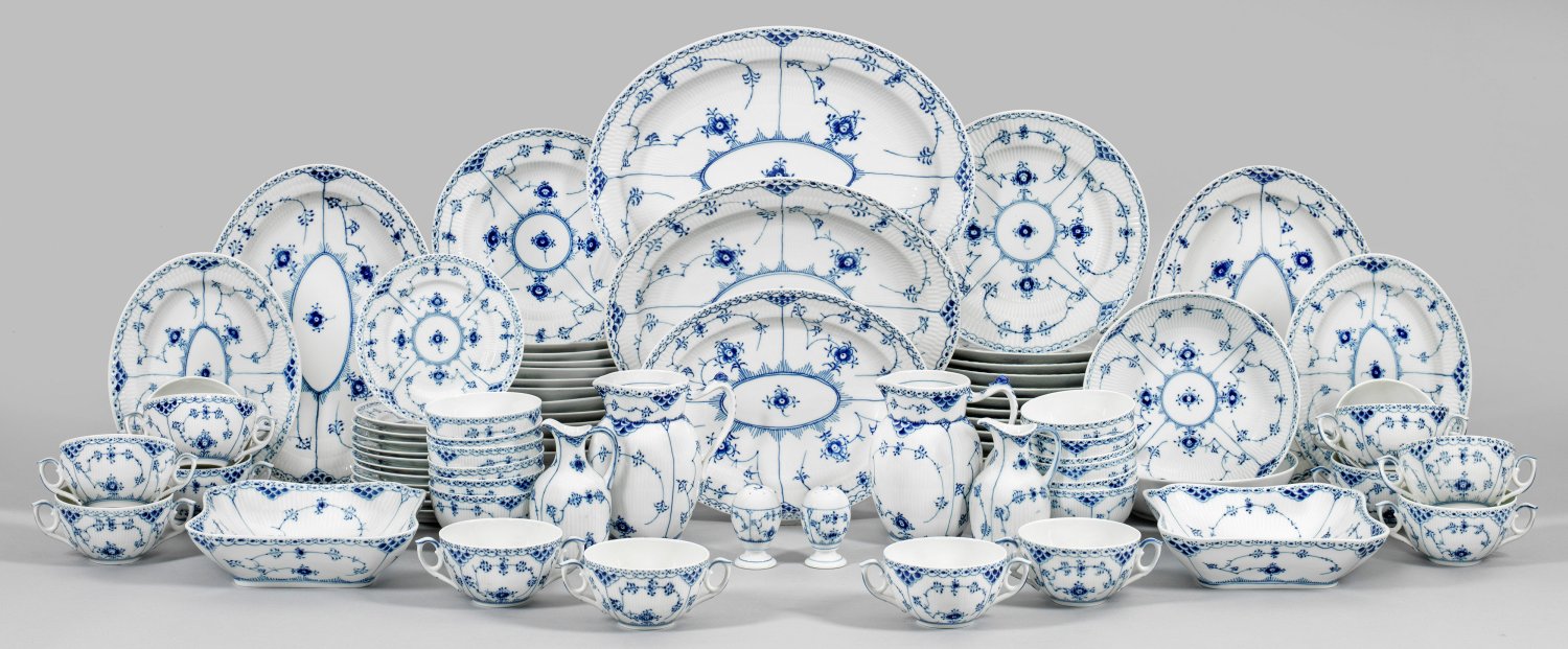 für zwölf Personen. 65-tlg.; 12 Suppentassen mit Untertassen, 12 Suppen-, 12 Speiseteller, 12 Salatschalen, 7 Anbietplatten, 4 Anbietschalen, 2 Wasserkannen, Essig- und Ölkännchen, Salz- und Pfefferstreuer. Reliefdekor "Gebrochener Stab" mit "Musselmalet Halbspitze"-Dekor in unterglasurblauer Malerei. Beigabe: 2 Suppentassen. Manufakturmarke. H. 7 cm - 16 cm, Platten-L. 40 cm.