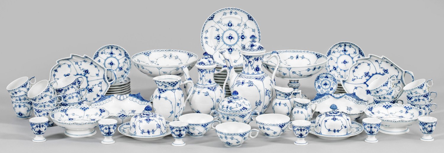 58-tlg.; Kaffee- und Mokkakanne, 3 Sahnegießer, Zuckerdose, 6 Kaffeetassen mit Untertassen, 9 Kaffeetassen Vollspitze mit Untertassen, 2 Teetassen mit Untertassen, 13 Frühstücksteller, 2 Butterdosen, 6 Eierbecher, 6 kleine Schälchen, 4 Fußschalen, 2 Schalen in Muschelform, 2 Schalen in Blattform. Reliefdekor "Gebrochener Stab" mit "Musselmalet Halbspitze"-Dekor in unterglasurblauer Malerei. Beigabe: Teetasse. Manufakturmarke. H. 5,5 cm - 24 cm.