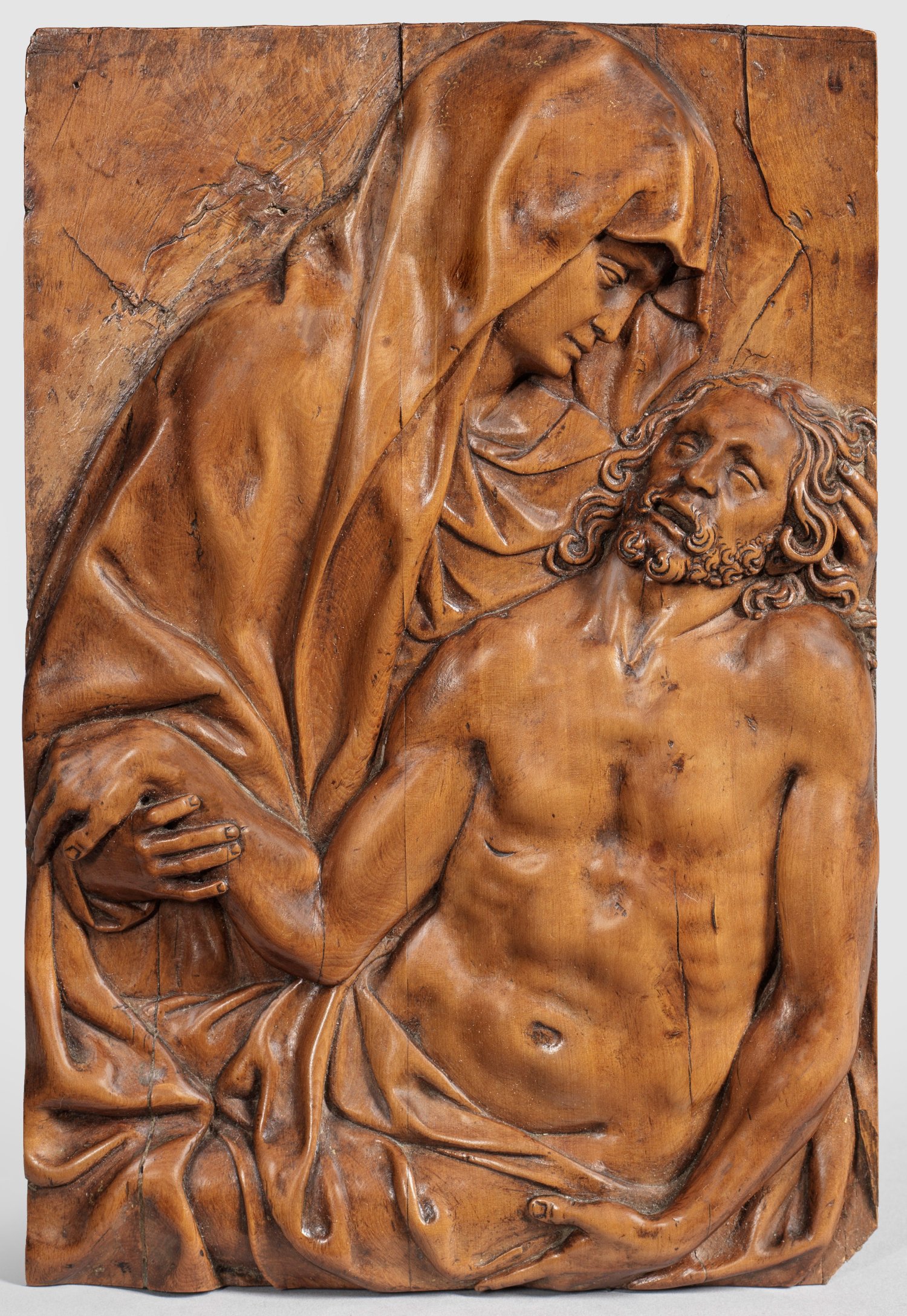Buchsbaum, geschnitzt, fein poliert und mit schöner Patina. Detailreich im Relief geschnitzte, kleine Tafel als Andachtsbild, das sich in seiner kompakten Komposition auf Maria und ihre innige Beziehung zu Christus konzentriert. Die Figuren fügen sich hierbei in das rechteckige Format ein: Maria blickt in geneigter Haltung im Profil auf das Haupt Christi, hält mit ihrer zarten Hand seinen rechten Arm, während sein Linker der rechten unteren Ecke der Tafel folgt. Die enge Verbindung Mariens zu Christus wird auch in ihrem Mantel zum Ausdruck gebracht, der nicht auflösbar mit dem Tuch Christi verbunden ist. Virtuos hat der Bildschnitzer die Anatomie des Körpers Christi und seinen nach hinten fallenden Kopf mit dem langen, gewellten Haar und dem gelockten Bart wiedergegeben. Verso alte Besitzerinschrift. Partiell ger. rest. in der oberen Partie des Hintergrundes, rechte untere Ecke ger. besch.; 19,2 cm x 12,9 cm.
