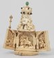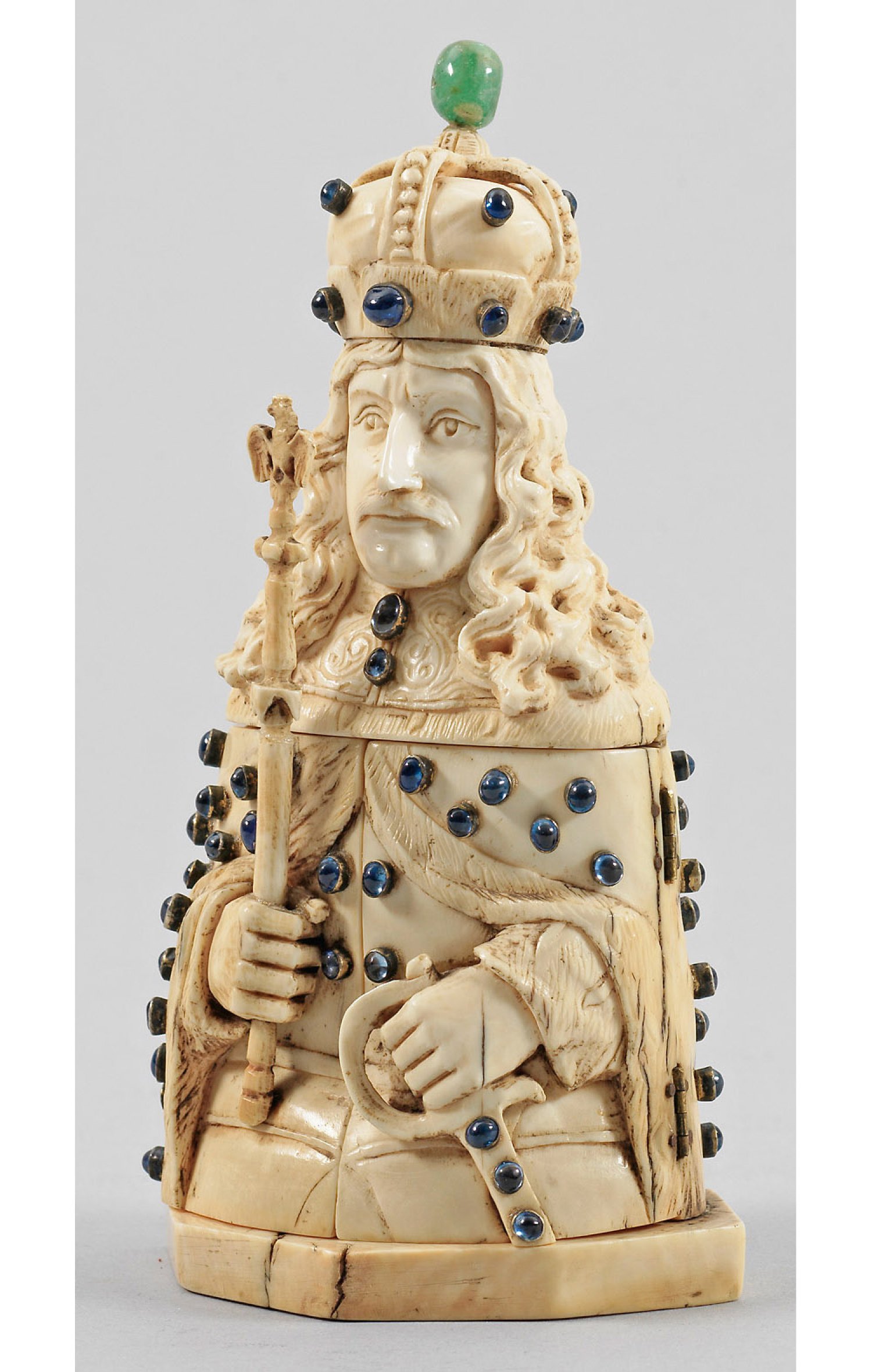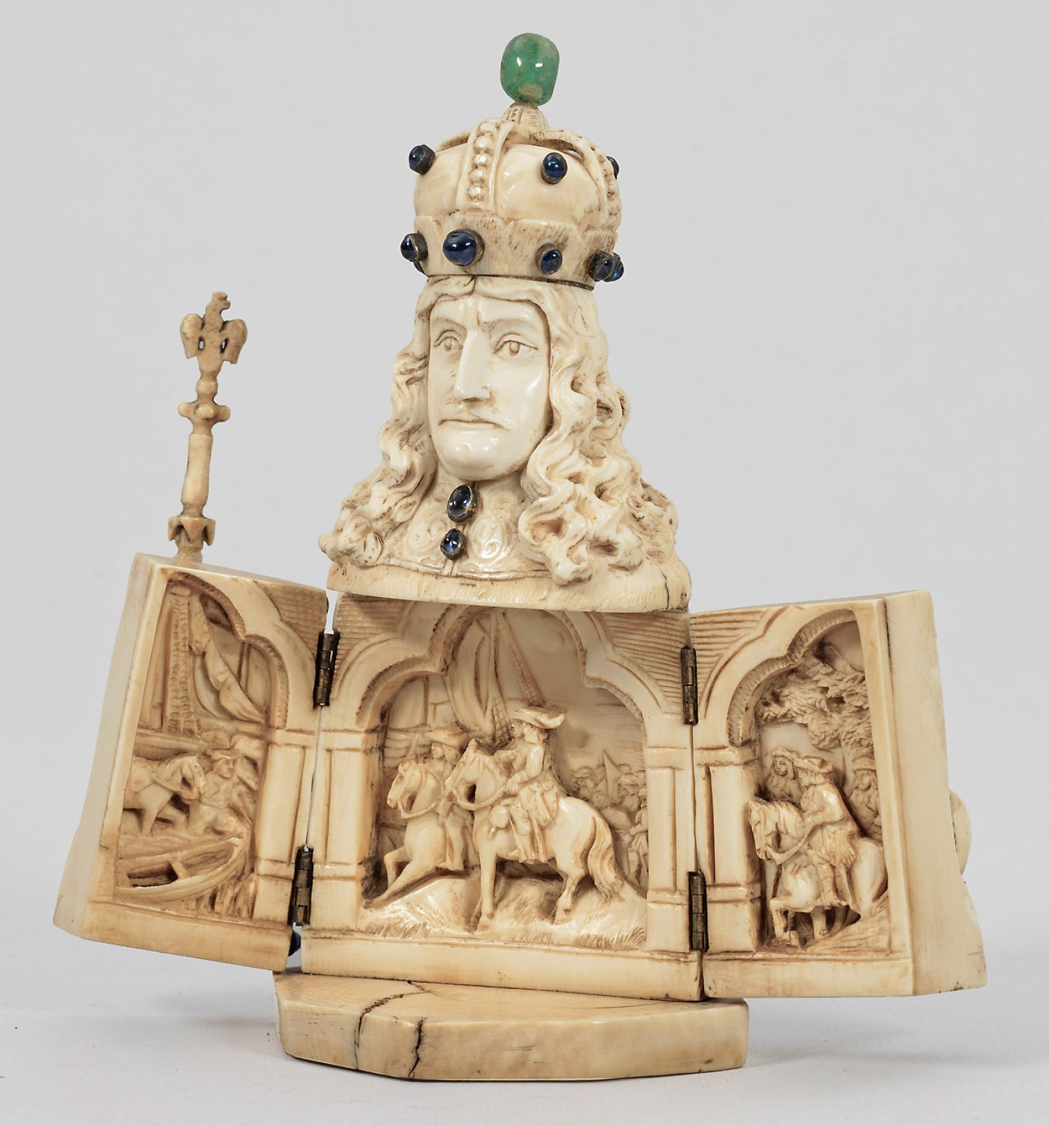 Elfenbein, vollplastisch geschnitzt; Farbcabochons. Halbfigurige Büste des Kurfürsten in Harnisch und mit Hermelinmantel, mit seiner linken Hand einen Degen und mit seiner rechten Hand ein Zepter haltend. Torso als aufklappbares Triptychon mit sehr fein reliefplastisch geschnitzter, vielfiguriger Darstellung einer historischen Szene. Kreuzbekrönung fehlt. H. 14,8 cm.