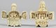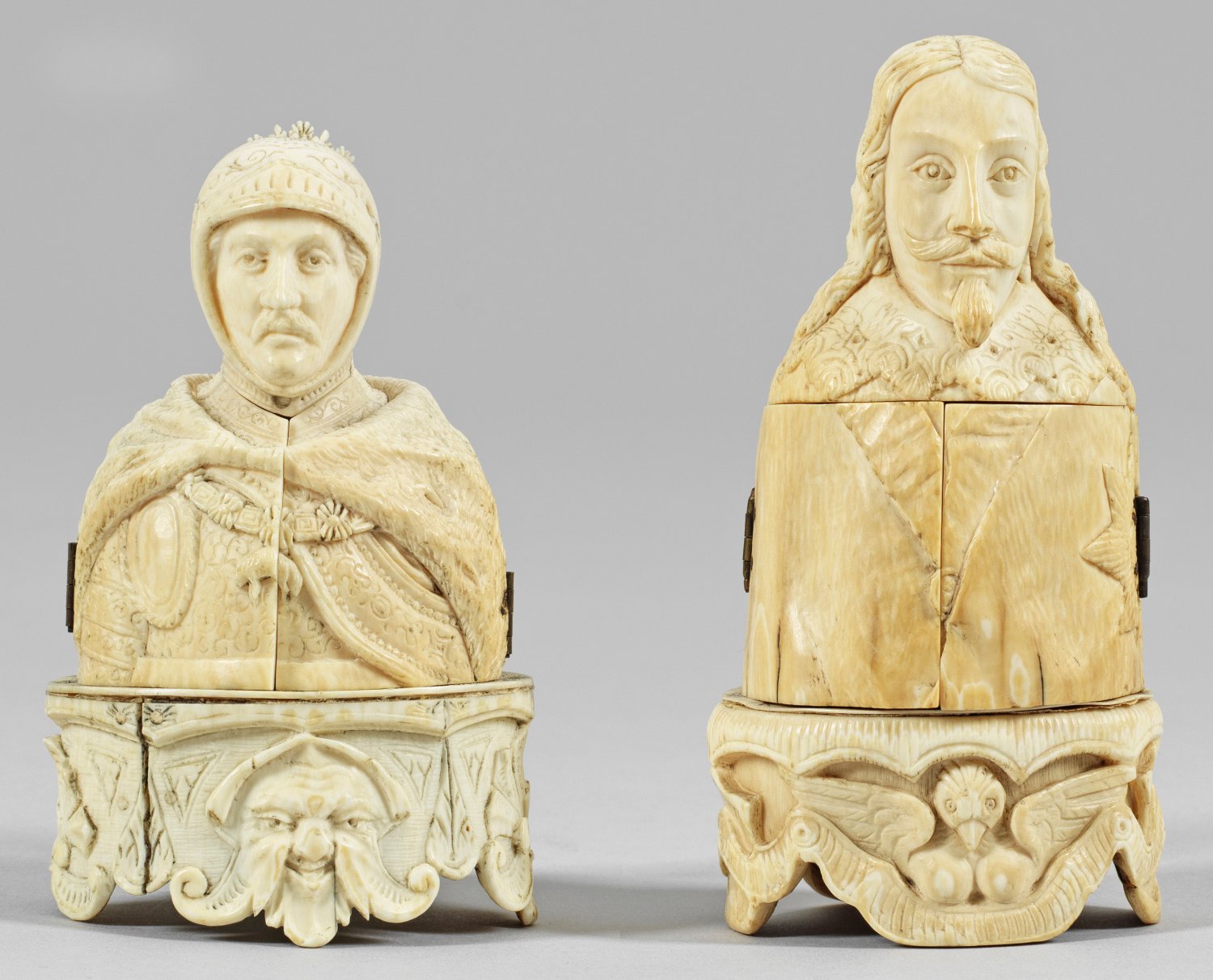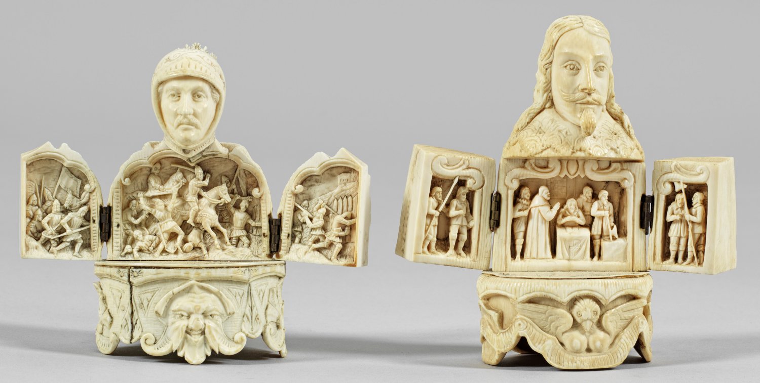 Elfenbein, vollplastisch geschnitzt. Auf jeweils breitem Reliefsockelband die sehr qualitätvollen Darstellungen Karls des Kühnen, Herzog von Burgund, in fein dekorierter Prunkrüstung, Hermelinmantel und dem Orden zum Goldenen Vlies sowie eines Adeligen mit Spitzbart, feinem Spitzenkragen und seitlichem Ordensstern. Die Brustpartie je als Triptychon aufklappbar mit reliefplastischen, sehr fein geschnitzten Szenen, zum einen der Schlacht von Nancy sowie einer vielfigurigen Gerichtsszene mit Henker und Richter. Teils besch.; H. 11,5 und 13 cm.