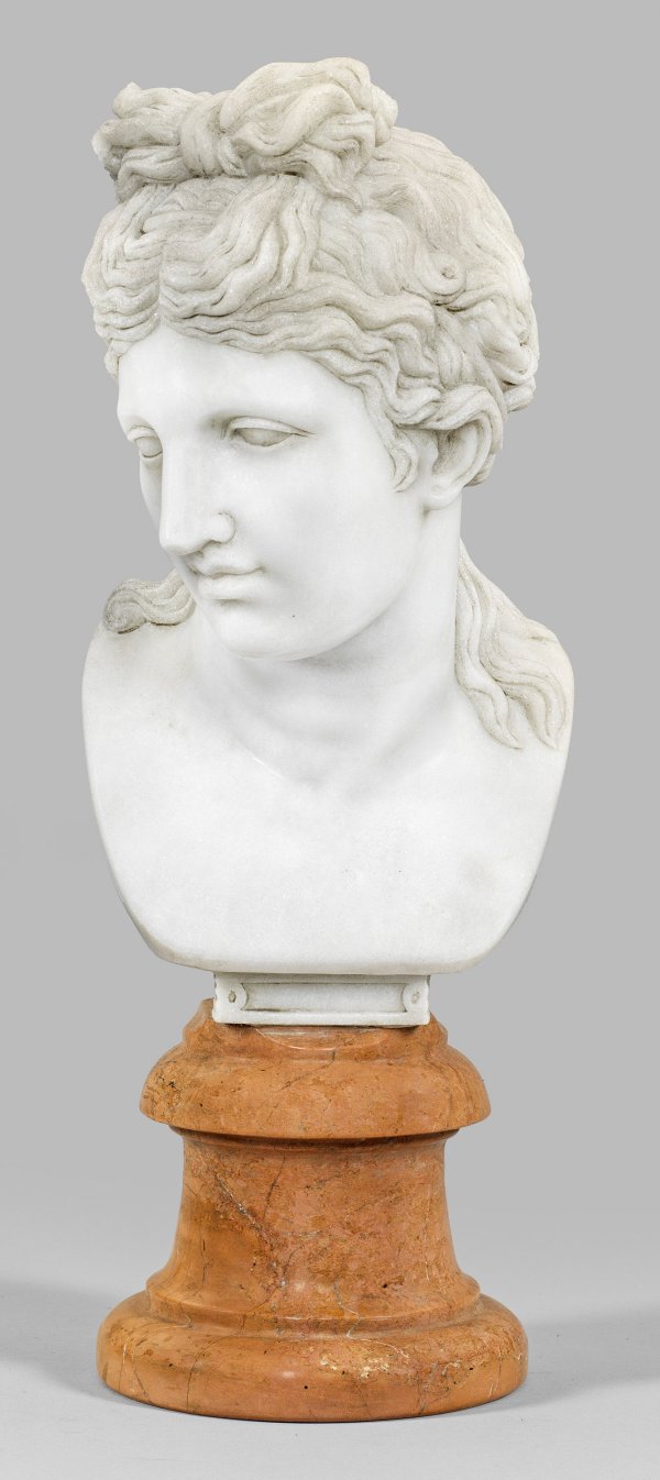 Weißer Marmor, die Plinthe aus apricotfarbenem Marmor. Neoklassizistische, vollplastisch gearbeitete Büste mit Kopf im Dreiviertelprofil nach einem antiken, hellenistischen oder römischen Vorbild. Ges.-H. 56 cm.
