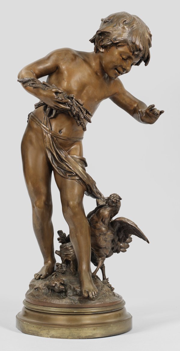 Große Bronze, braun patiniert. Sign.; Gießerstempel "M. D MEDAILLE D'OR PARIS". Vollplastische, auf dem Sockel frei drehbare Darstellung des Knaben als Halbakt, der ein Ährenbündel trägt und von einer, ihr Küken beschützenden Henne am Lendentuch gezogen wird. Große, subtil modellierte und sorgfältig ausgeführte Bronzeplastik des Künstlers, der 1861-1913 auf dem Salon ausstellte. Auguste Moreau war der Sohn des Bildhauers Jean-Baptiste-Louis-Joseph Moreau und der jüngere Bruder der Bildhauer Hippolyte Moreau und Mathurin Moreau. Er gehörte zu den wichtigsten und beliebtesten Bildhauern zur Zeit Napoleon III. und der Belle Epoque. Mit Vorliebe stellte er allegorische Motive dar, anmutige Frauen, Kinder, Putten und Amoretten. Ges.-H. 75 cm.