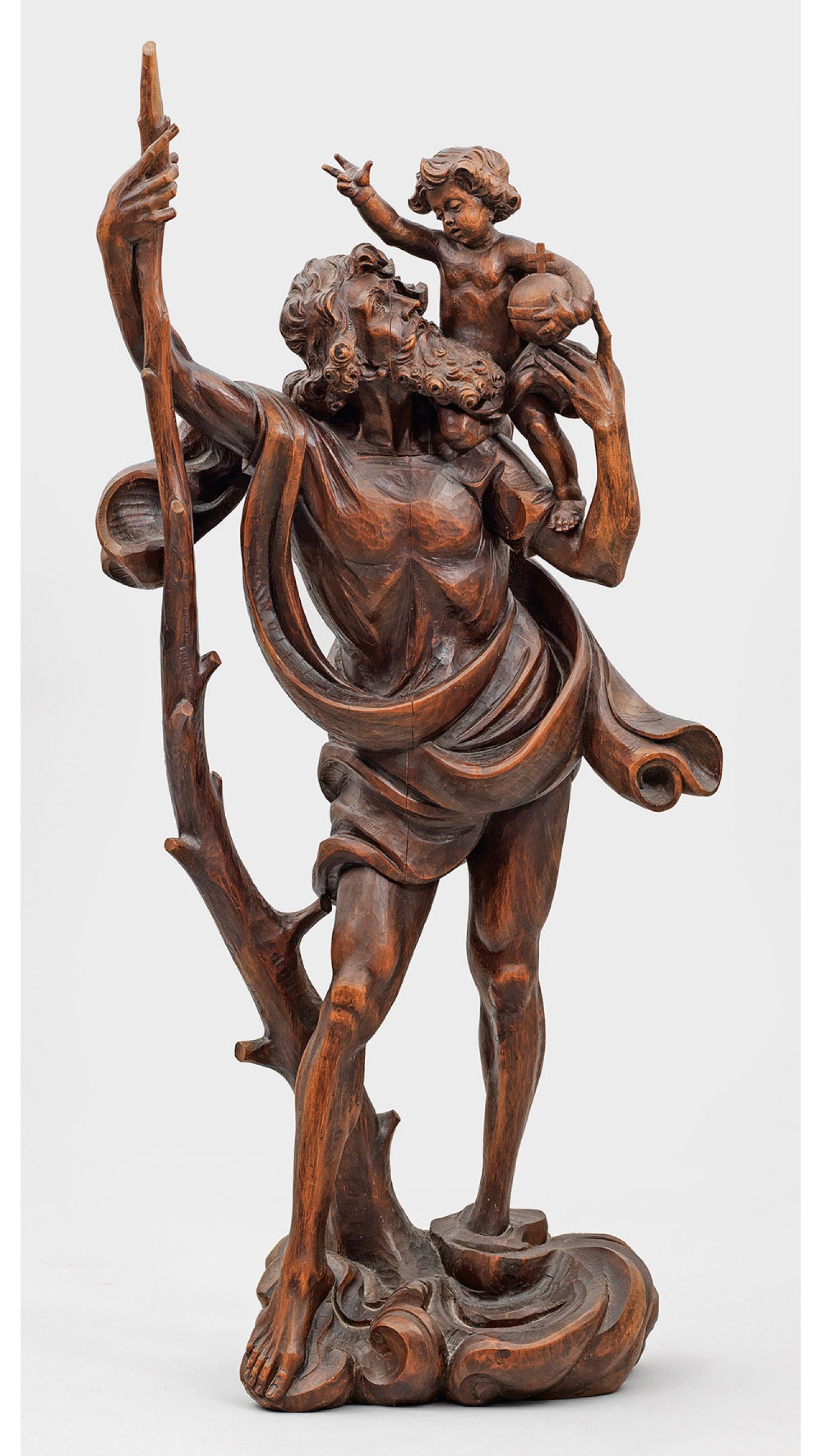Lindenholz, geschnitzt und dunkelbraun gebeizt. In der Tradition der Grödnertaler Skulpturen ausgeführte, vollplastische Gruppe; der nur mit einem weiten Tuch gewandete Christopherus in den Wellen eines Flusses stehend, sich mit der rechten Hand auf einen Aststab stützend und auf der linken Schulter das ihn segnende Christuskind tragend. H. 121 cm.