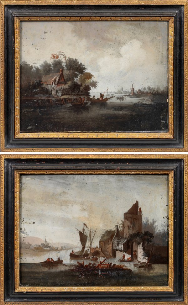 Gegenstücke. Atmosphärisch ruhige Darstellung von Flusslandschaften mit tiefem Horizont und lebendig bewölktem, silbergrauem Himmel. Auf dem Wasser Staffagen aus Fischern in ihren Ruder- und Segelbooten in architektur- und baumbestandenen Uferlandschaften, flankiert von burgähnlicher Ruine sowie einfachem, kleinem Fischerhaus. Am Horizont weitere schemenhafte Fischerboote sowie die Silhouetten größerer Städte mit Kirchtürmen, Häusern und einer Mühle. Nach Vorbild des niederländischen Landschaftsmalers Jan van Goyen (1596 Leiden - 1656 Den Haag). Hinterglasmalerei in Grau- und Brauntönen. Ebonisierte und vergoldete Holzrahmen. 30,5 cm x 23 cm.