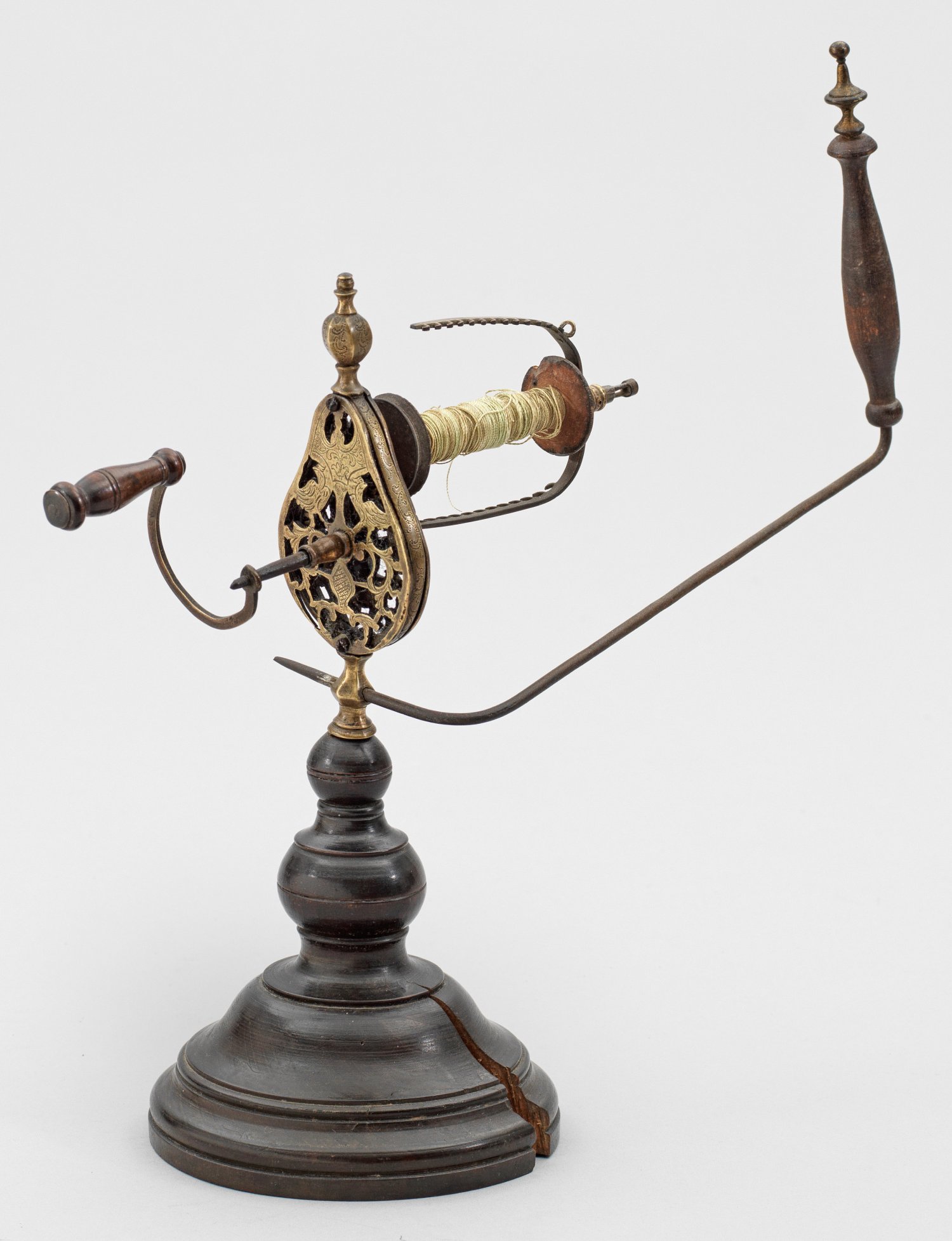 Holz, gedrechselt und ebonisiert. Konischer, runder Balusterstand, übergehend in filigran durchbrochen gearbeiteten Metallaufsatz, verziert mit zwei stilisierten Vogeldarstellungen und volutiertem Blattwerk. Davon ausgehend Kurbel mit Zahnradantrieb, drehbares Spulenlager mit Spinnflügel und zarten Flügelhaken. Schaft mit Spannungsriss. H. 24,5 cm.