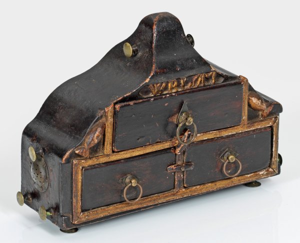 Ebonisiertes Obstholz und Messing, Eisen verzinkt. Querrechteckiges Kästchen mit passig geschweiftem Abschluss. Drei Schubladen mit Metalleinlagen für Würmer und Köder, beidseitig der Wandung Luftlöcher und Metallringe als Handhaben. Die Schauseite gegliedert durch goldgefasste Streben und zwei reliefplastisch geschnitzte Fische. Oberhalb bez.; H. 15,5 cm; 21 x 7 cm.