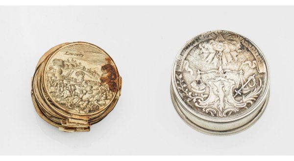 Kleine und feingliedrig miteinander verbundene, runde Kupferstiche mit detailreich dargestellten Schlachten des Siebenjährigen Krieges (1756-1763) u. a. die Schlacht bei Rosbach oder Lowositz, bez.; Dazu kleine Dose aus Silber mit flachem Deckel und Darstellung des göttlichen Auges über Wolke mit ausgestreckter Hand, eine Waage haltend. Im Deckel Kupferstich mit Reiter und Bez.; 39,5 cm x 15,5 cm.