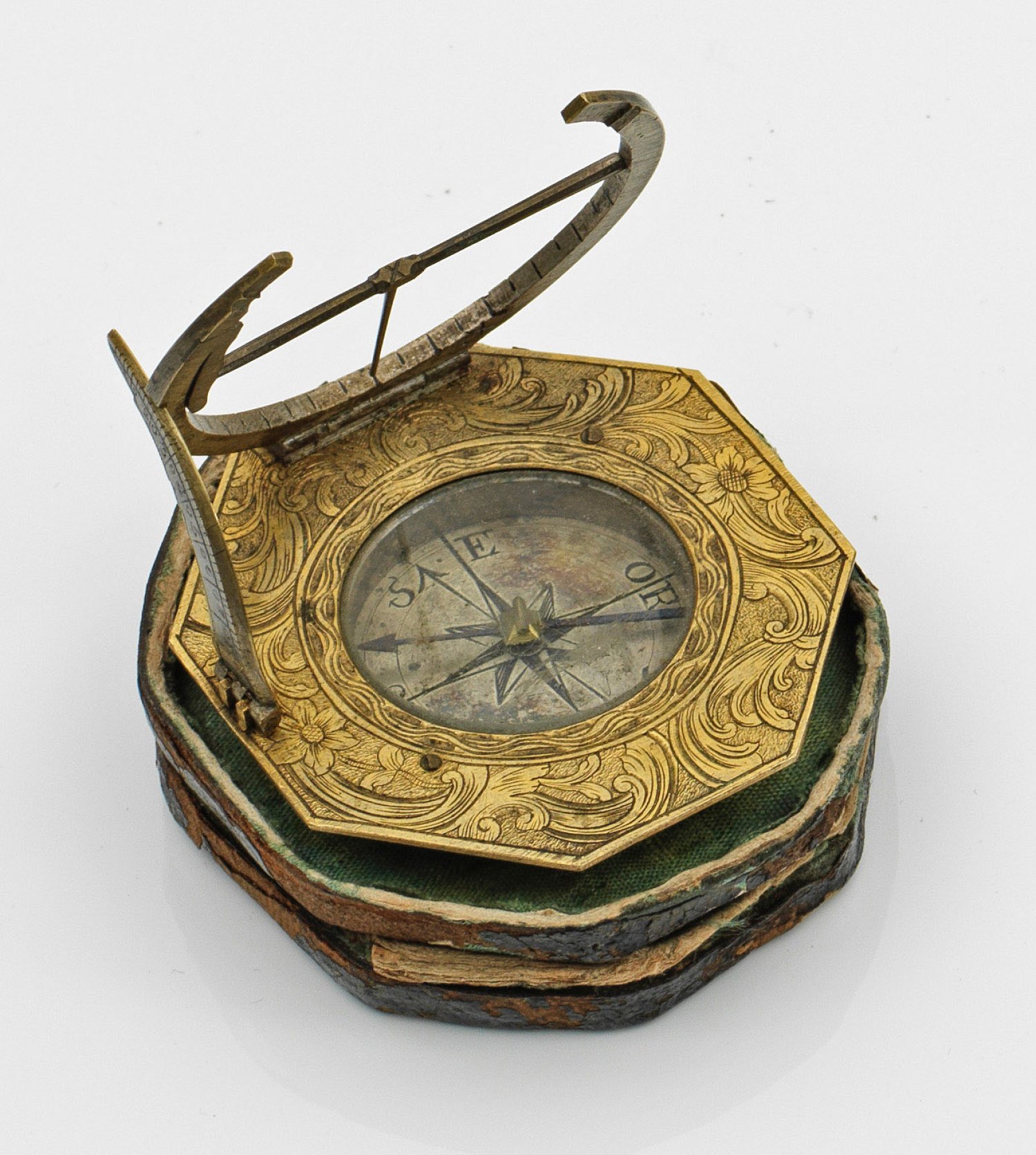 in originalem, mit Leder bezogenem Etui. Messing, graviert. Oktogonaler Korpus mit eingelassenem Kompass, umzogen von graviertem Floraldekor. Versilberte Innenseite, gebläute Kompassnadel und Glasabdeckung. Klappbare Stundenskala mit scharniertem Gradbogen und schwenkbarem Stabgnomon. Rückseitig bez. u. a. mit der Angabe der Polhöhe für Nördlingen, Danzig, Bozen und Lissabon sowie Sign. von Lorenz Grassl (tätig zwischen 1760-1805). 5,8 cm x 5,4 cm.