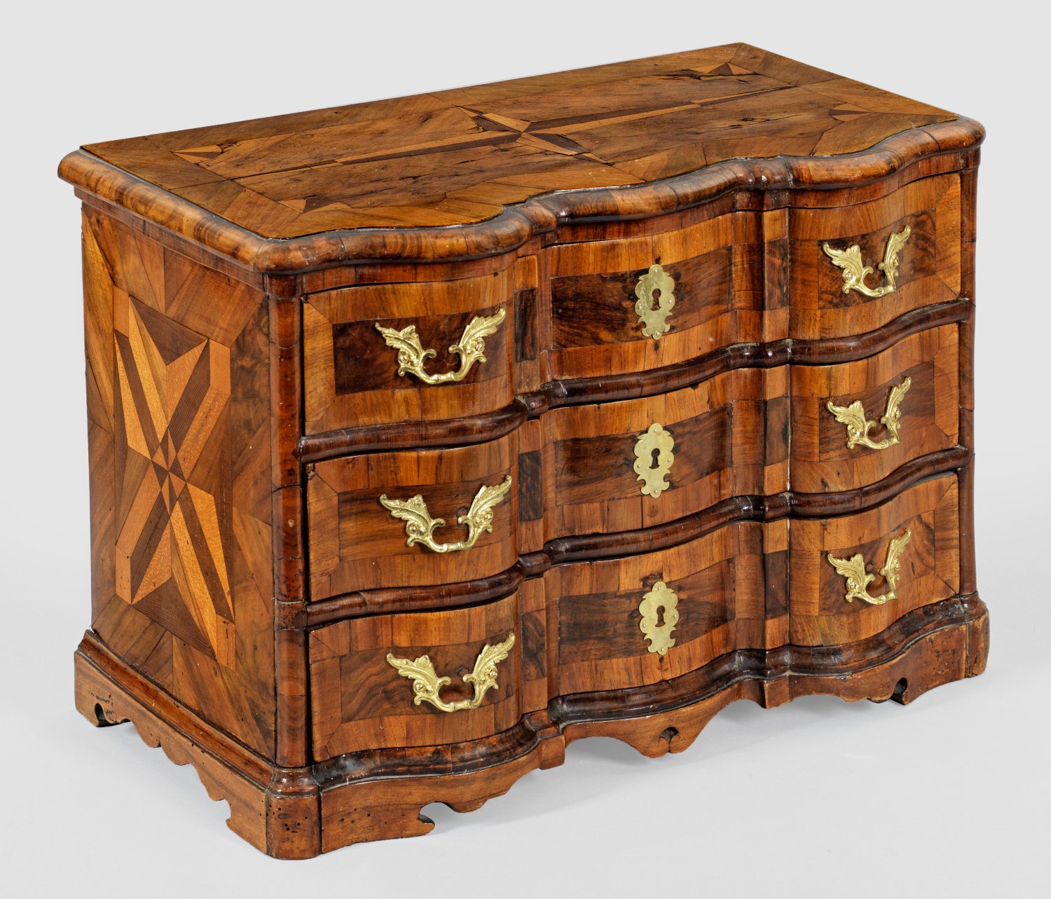 Nussbaum, furniert sowie Einlagen aus unterschiedlichen Edelhölzern. Gerader, querrechteckig angelegter Korpus mit gerundeten Lisenen auf gesägtem Zargensockel. In der gegliederten Front drei mehrfach geschweifte Schubladen. Gering überstehende Deckplatte mit großem Faltstern. H. 30 cm. 44 cm x 24 cm.