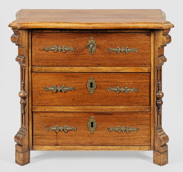 Nussbaum, furniert. Rechteckiger Korpus, flankiert von schräggestellten Ecklisenen mit applizierten Voluten- und Balustermotiven auf gekanteten Füßen. In der Front drei Schubladen. Passig geschweifte, profilierte Deckplatte. H. 37 cm. 42 cm x 24 cm.